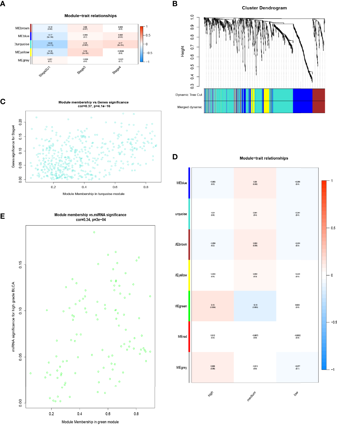 WGCNA was used for DE lncRNAs-mRNAs and miRNAs. (A) Correlation between RNA modules and clinical stage of samples. (B) Dynamic tree-cutting and merging dynamic methods to identify 14 RNA modules. (C) Sucessive analysis of brown mRNA-lncRNA modules with stage IV (cor. = 0.37, P = 4.1e-16). (D) Expression data of miRNAs from GEO-BCa were classified into three clinical features for WGCNA: high grade (high pathological grade with pathological T-stage ≥ pT2), medium grade (high pathological grade with pathological T-stage < pT2) and low grade (low pathological grade). (E) Correlation between green module (108 miRNAs) and high grade.