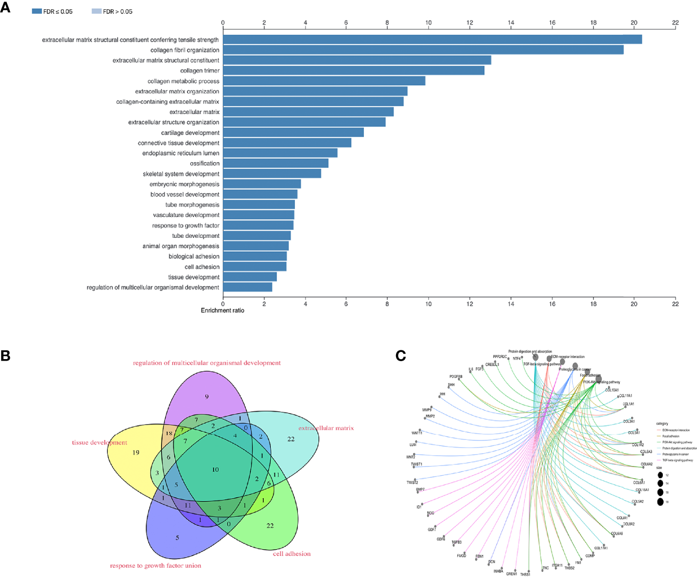 To screen for functionally enriched gene signatures associated with BCa invasion, progression, metastasis and poor prognosis. (A) The 395 co-expressed DE-mRNA enriched GO terms are mainly (FDR < 0.05) collagen fiber organization, extracellular matrix organization, vascular development, response to growth factors, bioadhesion, and tissue development. (B) Enrichment of biological processes such as extracellular matrix, tissue development, response to growth factors, cell adhesion and developmental regulation of multicellular organisms. (C) KEGG analysis of 395 co-expressed DE-genes.