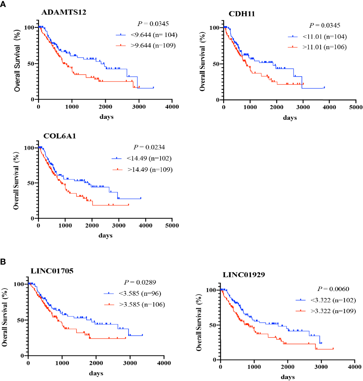 Survival analysis performed for 8 core lncRNAs and 28 core mRNAs. The Kaplan-Meier curve shows the percent survival rate for BCa patients based on RNA expression in BCa tissue samples. The P-value is calculated using the log-rank test (p < 0.05) (A, B).