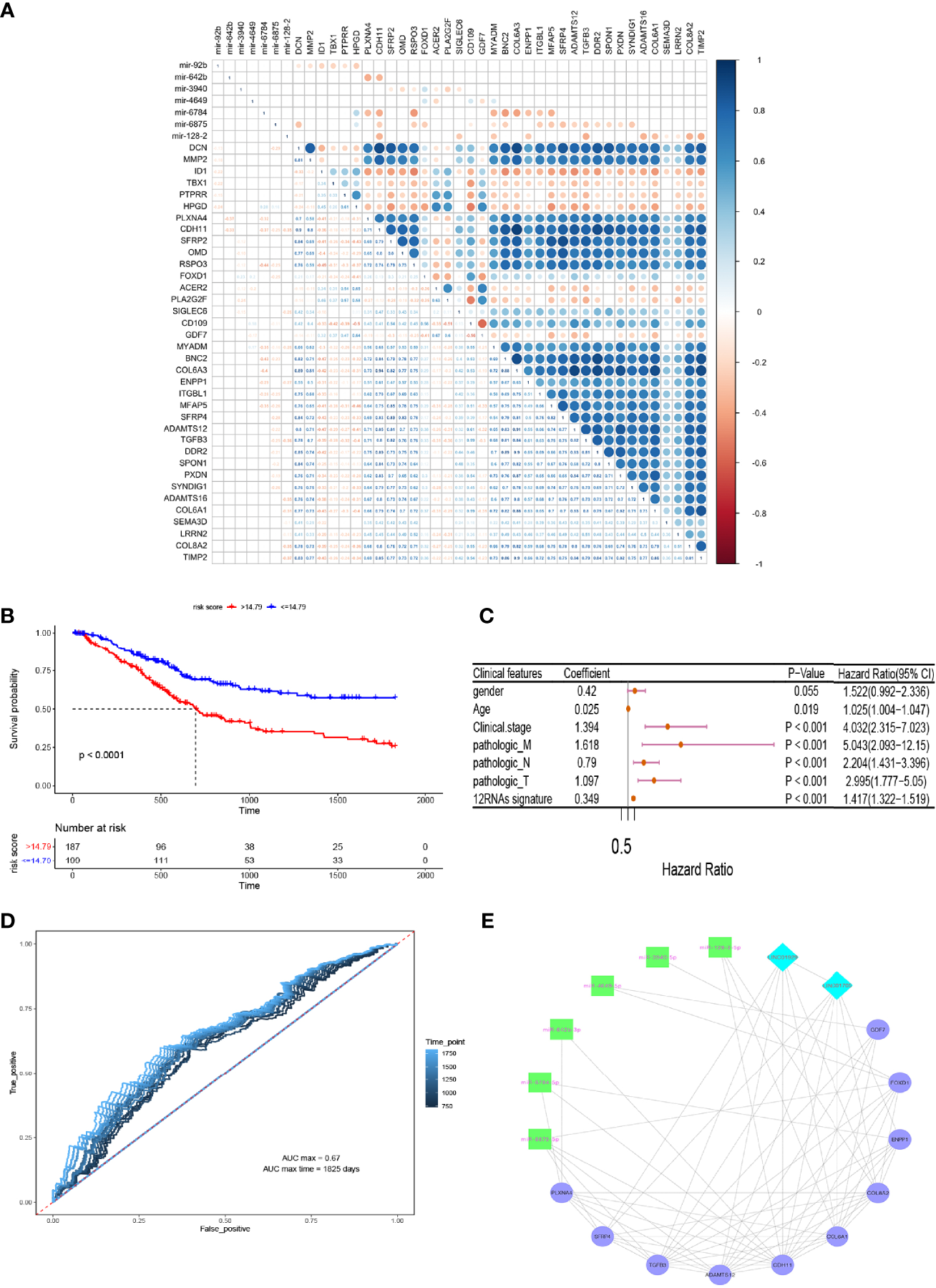 Prediction of miRNA-mRNA pairs and RNA-based signature prognostic models. (A) Pearson correlation analysis to establish a correlation coefficient matrix. (B) A RNA signature model for survival risk analysis. (C) univariate Cox regression analysis exhibited that the twelve-RNA signature was evidently positively correlated with overall survival of BCa patients. (D) 2 to 5 years dependent ROC curves. (E) Core lncRNA-miRNA-mRNA triple-regulatory co-expression network.