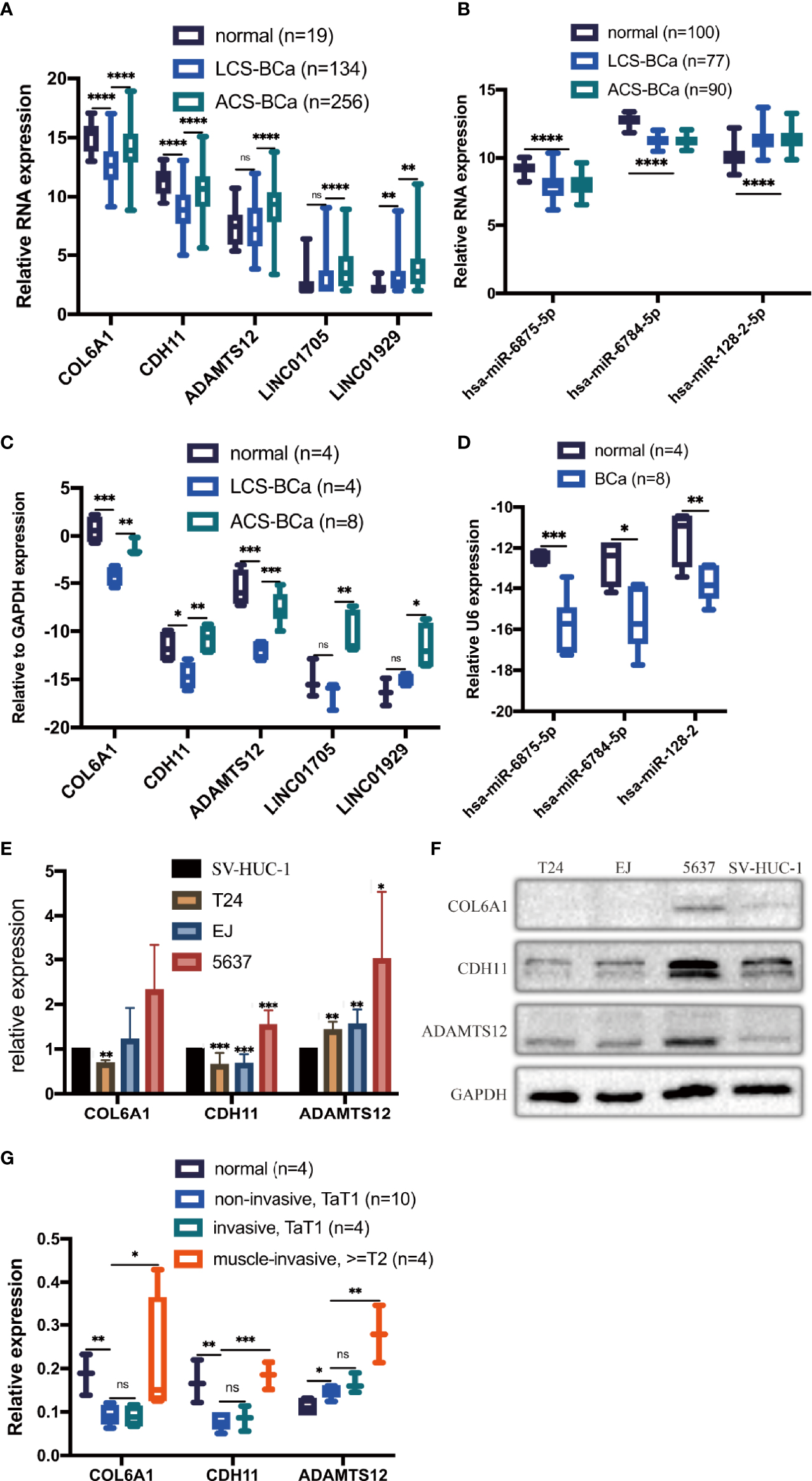 qRT-PCR results showed that the RNA levels of COL6A1, CDH11, and ADAMTS12 significantly increased in ACS-BCa compared with LCS-BCa tissue, also decreasing in LCS-BCa tissue compared with normal uroepithelial tissue; LINC01705 and LINC01929 significantly increased in ACS-BCa compared with LCS-BCa tissue. In contrast, hsa-miR-6875-5p, hsa-miR-6784-5p, and hsa-miR-128-2 decreased in BCa tissue compared with normal uroepithelial tissue. In summary, aside from the reverse tendency of hsa-miR-128-2 and the non-significant expression variation of ADAMTS12, LINC01705 and LINC01929 in LCS-BCa compared with normal tissue, the expression tendency and pattern of gene RNA levels were all consistent with DE analysis (Figures 6C, D).