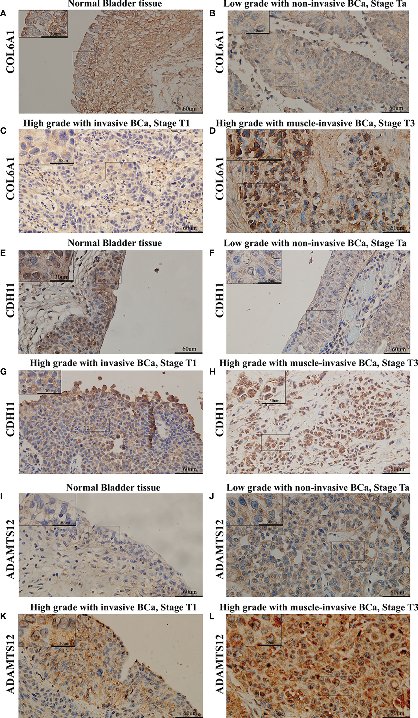 Expression of COL6A1, CDH11, and ADAMTS12 was measured using IHC in BCa tissues divided into different groups. (A) Expression of COL6A1 in normal bladder tissue. (B) Expression of COL6A1 in low grade with non-invasive BCa, Stage Ta. (C) Expression of COL6A1 in high grade with invasive BCa, Stage T1. (D) Expression of COL6A1 in high grade with muscle-invasive BCa, Stage T3. (E) Expression of CDH11 in normal bladder tissue. (F) Expression of CDH11 in low grade with non-invasive BCa, Stage Ta. (G) Expression of CDH11 in high grade with invasive BCa, Stage T1. (H) Expression of CDH11 in high grade with muscle-invasive BCa, Stage T3. (I) Expression of ADAMTS12 in normal bladder tissue. (J) Expression of ADAMTS12 in low grade with non-invasive BCa, Stage Ta. (K) Expression of ADAMTS12 in high grade with invasive BCa, Stage T1. (L) Expression of ADAMTS12 in high grade with muscle-invasive BCa, Stage T3.