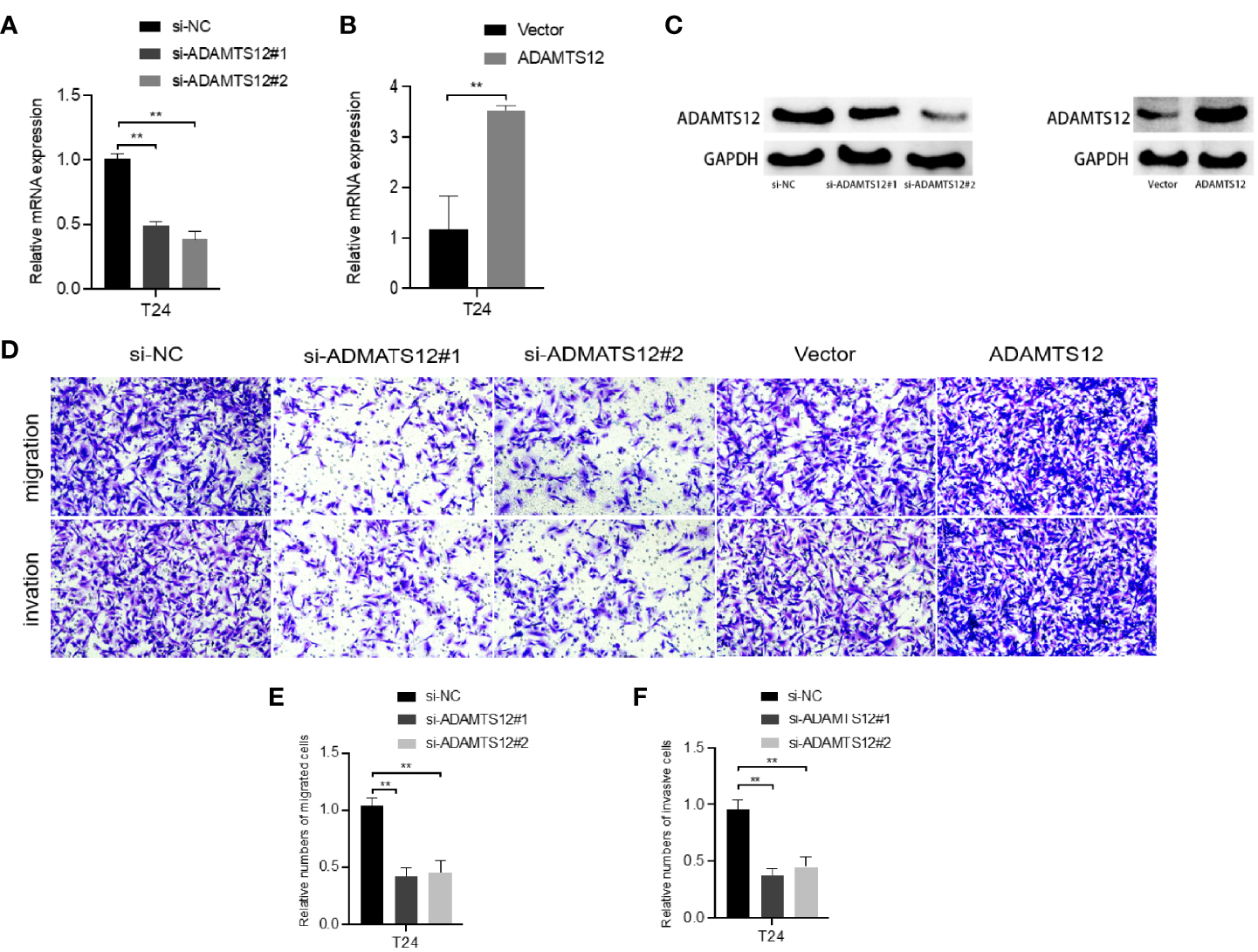 The current data suggest that ADAMTS12 is differentially expressed in advanced bladder cancer compared to normal tissues. Therefore, we selected ADAMTS12 for further in vitro functional assays to verify whether it has an effect on the progression and invasion of bladder cancer. We knocked down ADAMTS12 with siRNA. qRT-PCR (Figure 8A) data showed that RNA expression was significantly downregulated in the si-ADAMTS12 group compared to the si-NC group, demonstrating that we successfully knocked down ADAMTS12. After that, ADAMTS12 was overexpressed with plasmid, and qRT-PCR (Figure 8B) data showed that compared to the Vector group Western blotting experiments (Figure 8C) also further confirmed the knockdown and overexpression effects. Transwell assays (Figures 8D–F) confirmed that knockdown of ADAMTS12 inhibited invasion of T24 cells while overexpression of ADAMTS12 enhanced the invasion of T24 cells.
