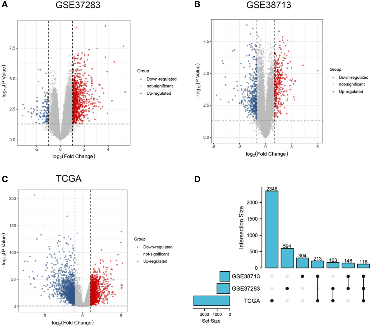 Differential expression analysis and Upset plots. (A–C) are the differential analysis from GSE37283, GSE38713, and TCGA datasets, respectively, and the results are shown as volcano plots. Blue indicates downregulation, and red indicates upregulation. (D) Upset plots showing the intersection or concatenation parts of the three differentially expressed genes.