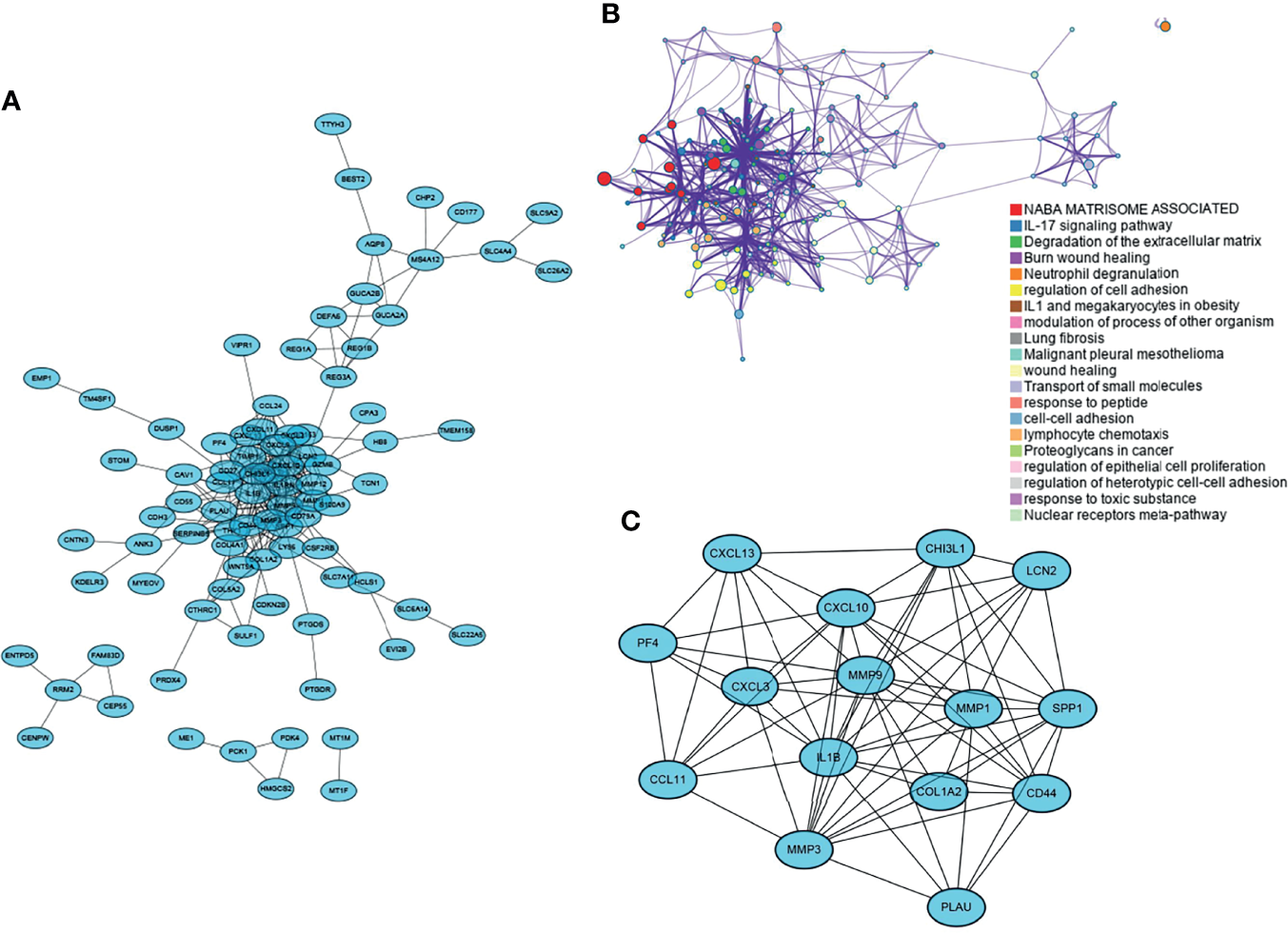 The screened DEGs were imported into the STRING database for PPI network construction and visualized using Cytoscape (Figure 2A). Networks with rich terms in DEGs were visualized, and the top 20 most significant terms included NABA MATRISOME ASSOCIATED, the IL-17 signaling pathway, and other functions or pathways (Figure 2B). Six gene modules were obtained using the MCODE plug-in in Cytoscape, and the most tightly connected module was selected. It included 15 nodes and 69 edges (Figure 2C).