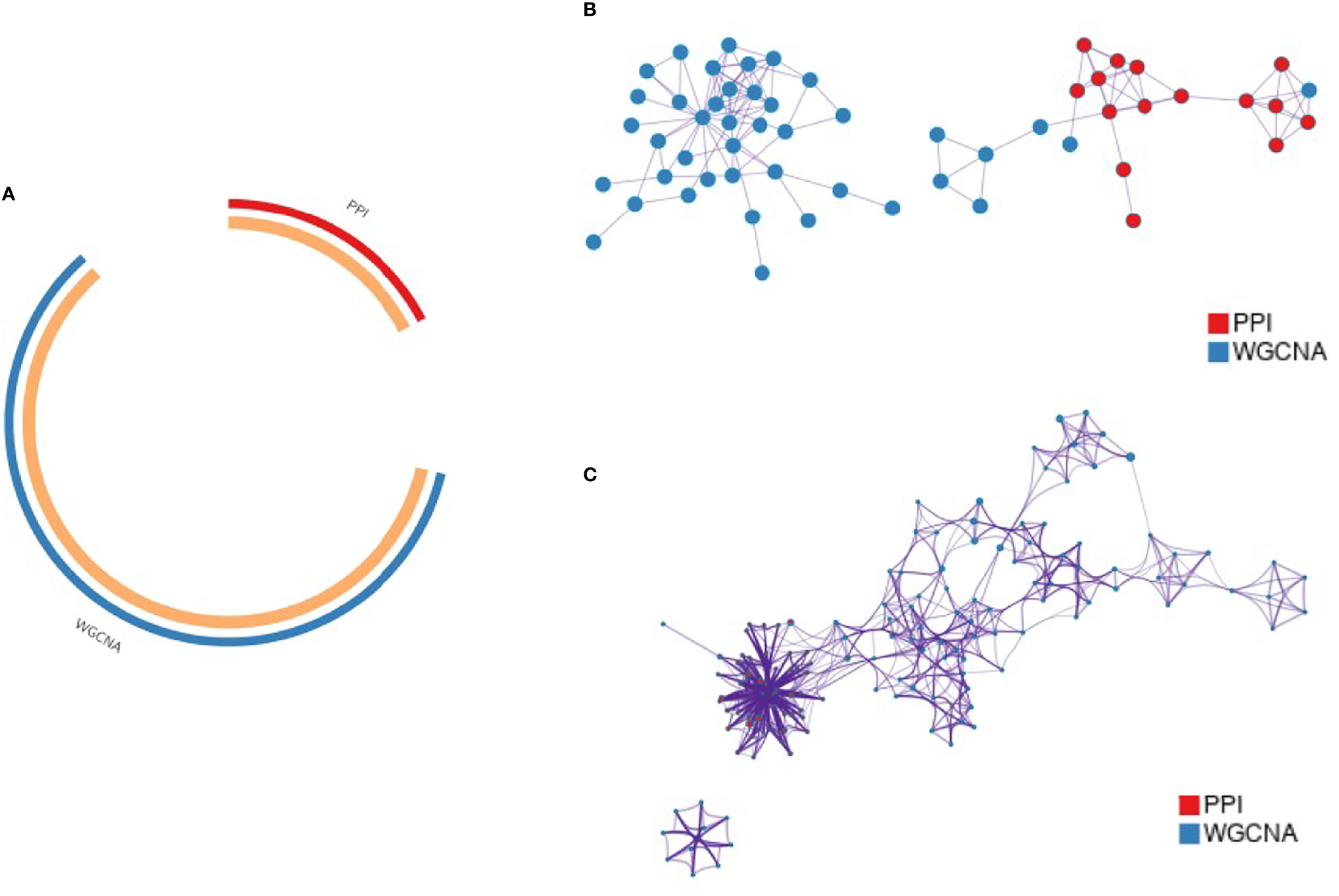 Functional clustering of key genes by Metascape. (A) Circos plot showing the overlap of key gene modules from PPI and WGCNA; (B) PPI network of genes in the merged cohort; (C) Pie chart showing the enriched terminology network of genes, with different colors indicating different cohorts.