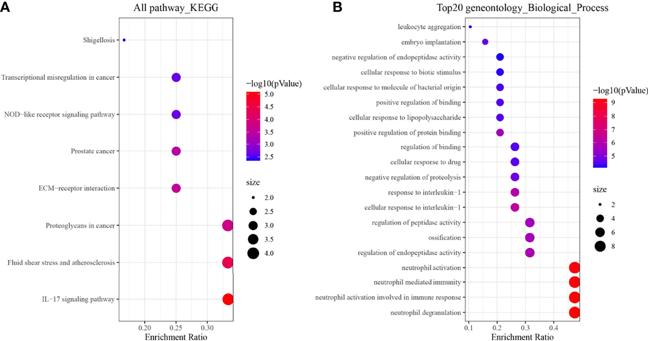Enrichment analysis results of 19 genes. (A) KEGG; (B) Biological process terms of the top 20 GO.