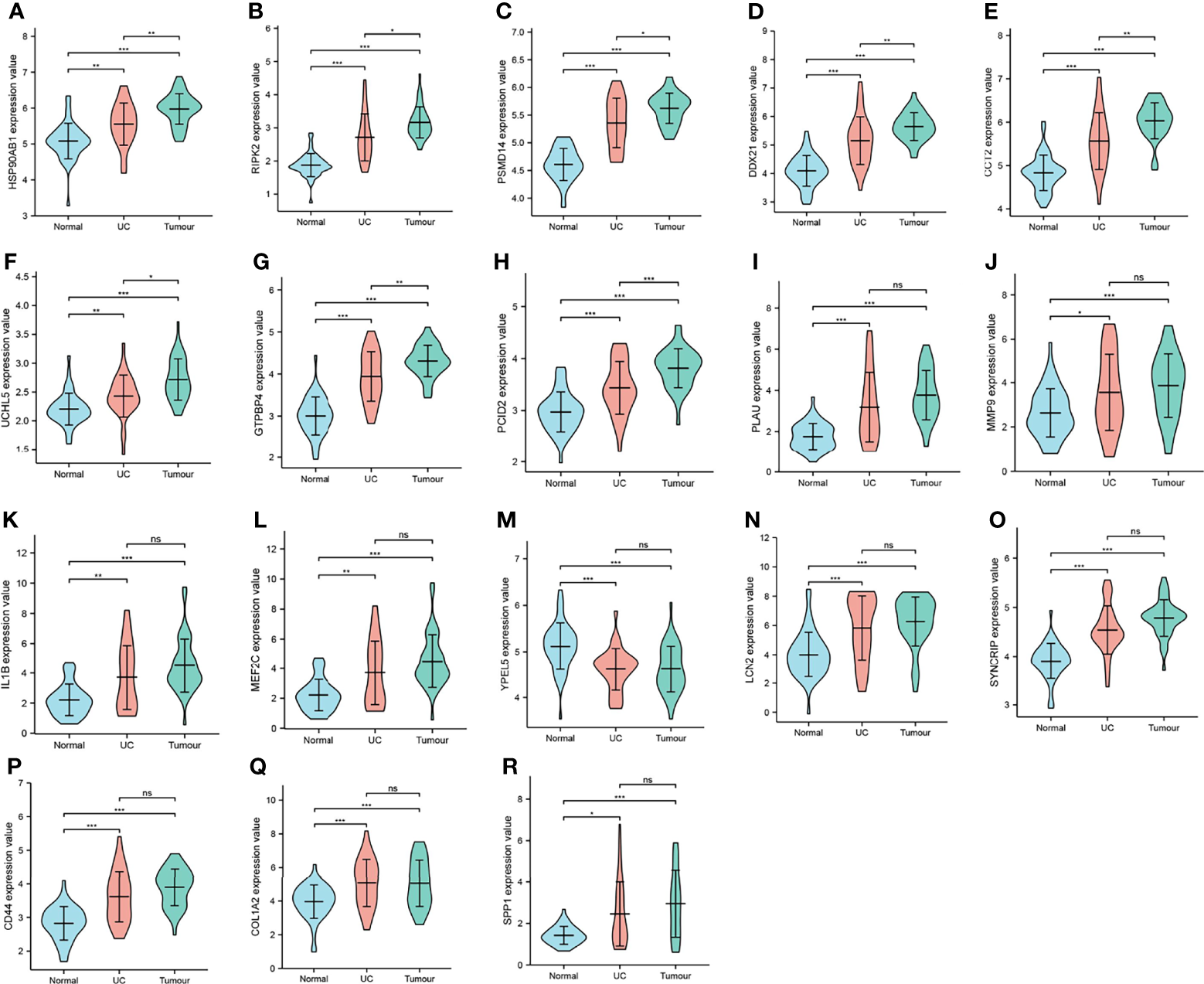 Expression distribution of key genes. (A–R) Expression level distribution of 18 key genes in normal, UC, and COAD tissues. *P < 0.05, **P < 0.01,***P < 0.001, ns, no significant. CHIL1 was not significantly different in all the three tissues, so it is not shown.