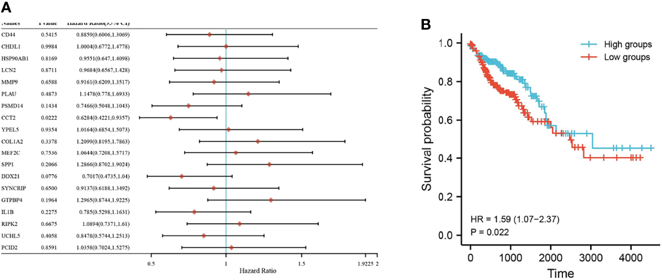 Survival of key genes in colorectal cancer samples. (A) Forest plot with one-way Cox analysis for 19 genes; (B) Survival curve plot for CCT2. P < 0.05 is considered statistically significant.
