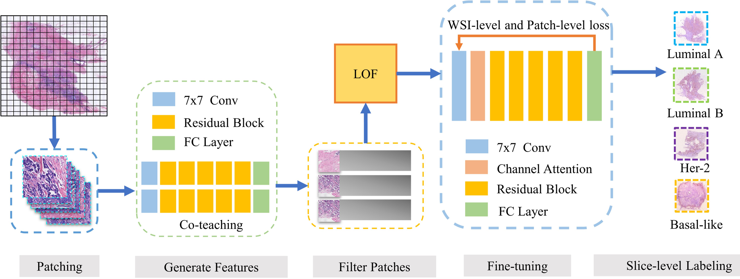 Molecular subtyping on H&E-stained pathological images is a challenging task since we can only obtain the slide-level label for each molecular subtype without detailed local region information. Even experienced pathologists have difficulty annotating corresponding molecular subtype regions in H&E pathological images (7). Due to the extremely high resolution of whole slide images (WSIs), WSIs are computationally infeasible to be directly fed into a network for training and testing; therefore, they are usually divided into small patches. The lack of patch-level labels makes it a weak label problem for machine learning.