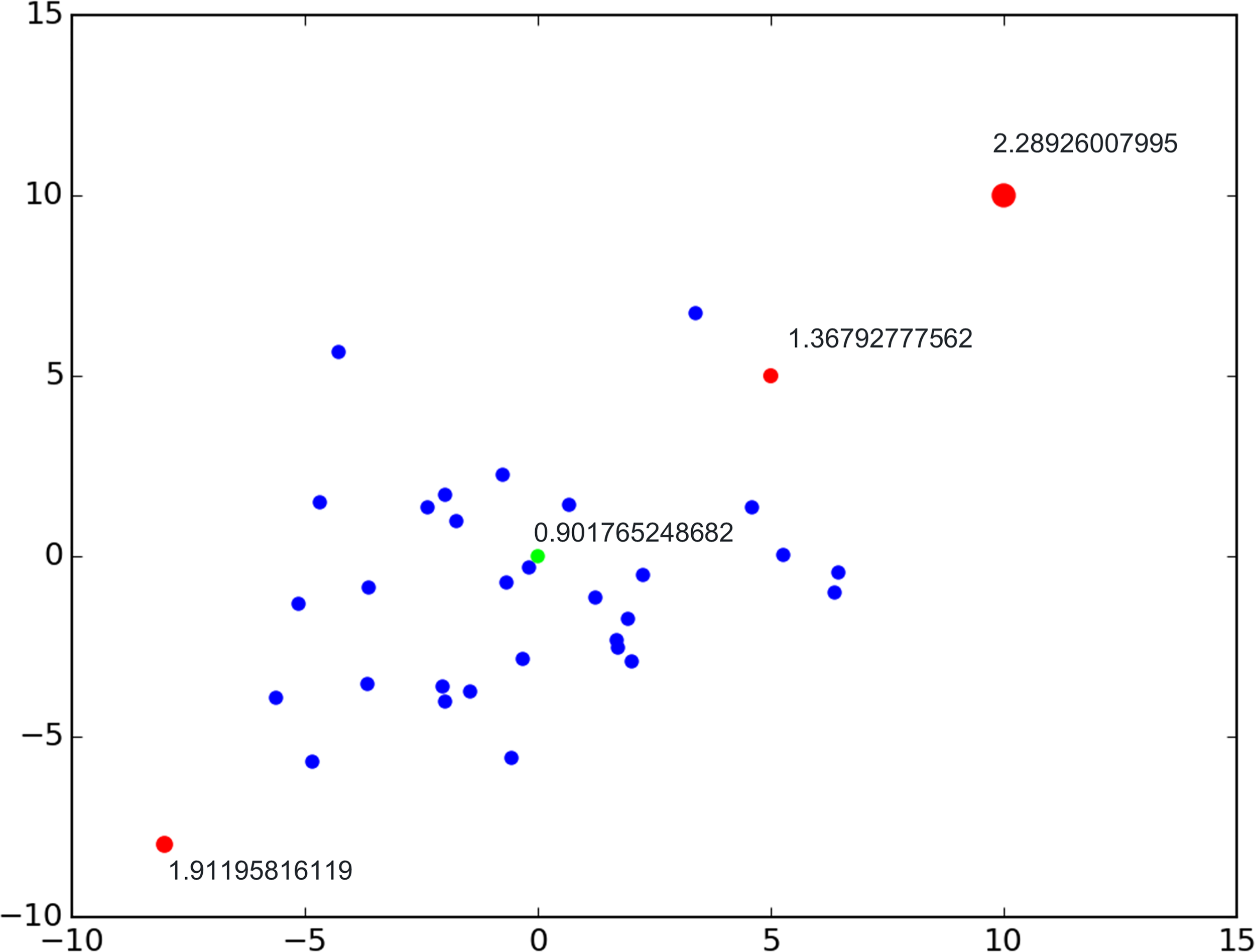 Figure 2 shows an example of point set (blue point) in feature space for certain molecular subtyping. We query whether these four points are outliers of the point set. The green point is not an outlier with a lower LOF score, and the red points are outliers with high ones. The size of the red point is the value of the LOF scores and represents the abnormality degree of a certain point.