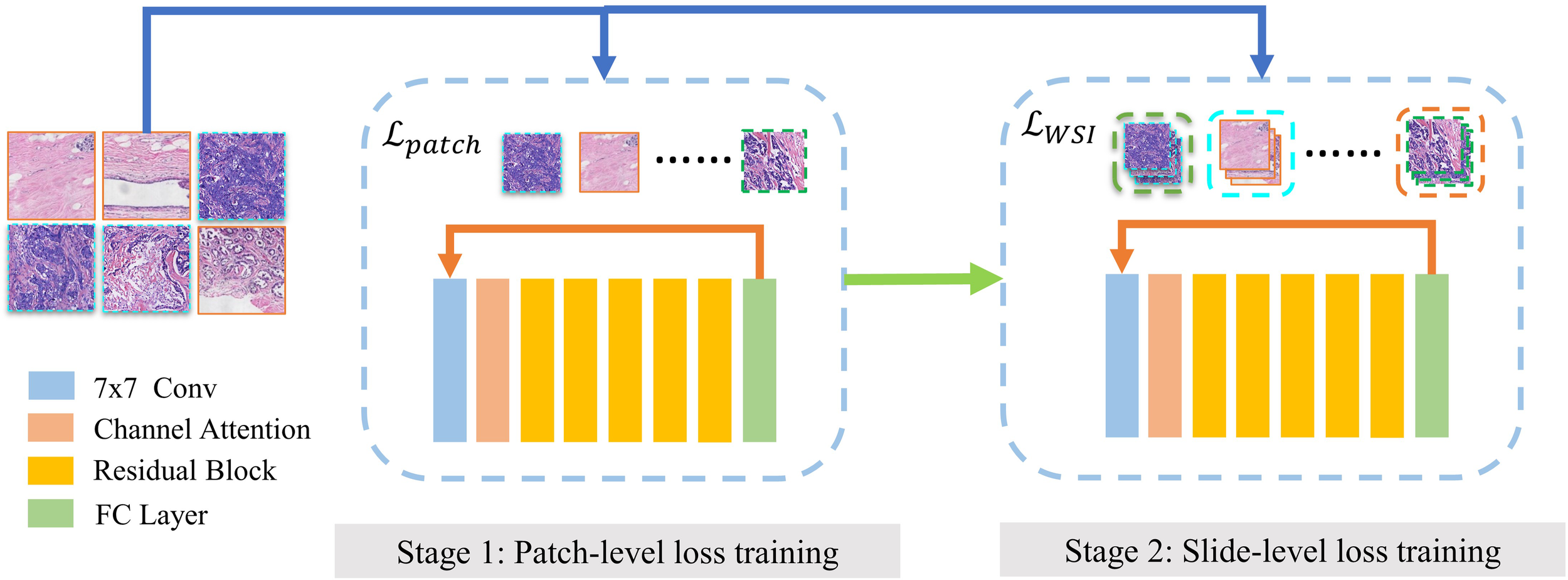 We introduce the slide-level loss function to impose global information constraints to guide the MIL training. The slide-level loss function LWSI is defined as Formula 1, where LWSI represents the slide-level loss function of the ith pathological image defined as the cross-entropy function (32). NWSI represents the total number of pathological slides in the training set, and α is the weight of slide-level loss.