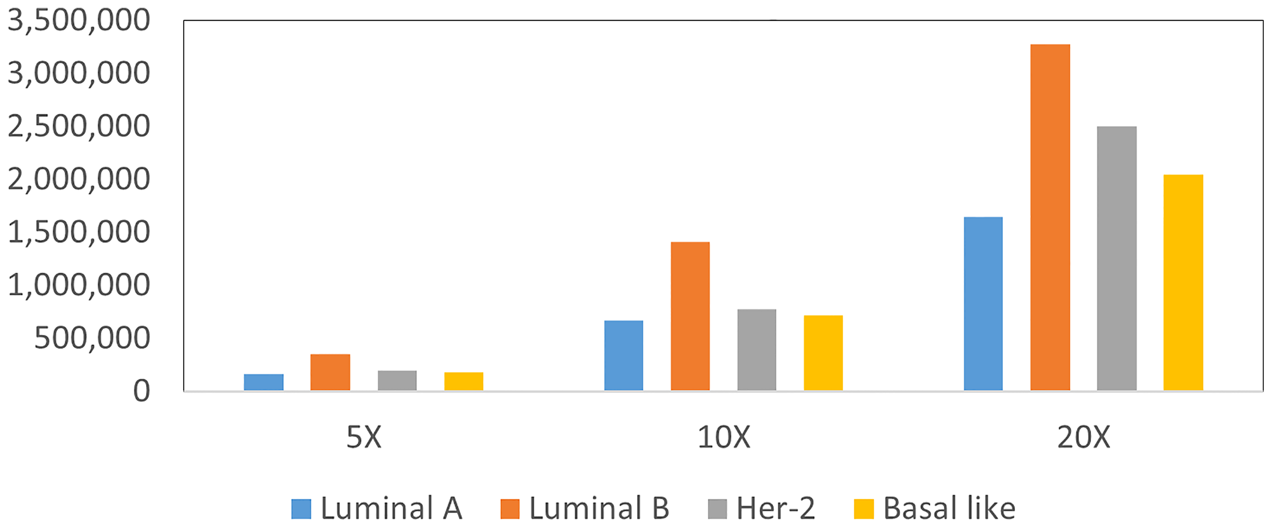 Breast cancer is intrinsically heterogeneous and has been commonly categorized into molecular subtypes since the late 1990s (1). According to various molecular expressions of certain genes, breast cancer can be classified into four molecular subtypes, namely, Luminal A, Luminal B, Her-2, and Basal-like (2). Molecular subtypes directly reveal the biological behavior of breast cancer and represent changes in gene expression, which can be used to determine tailored treatment approaches and predict prognosis (3).