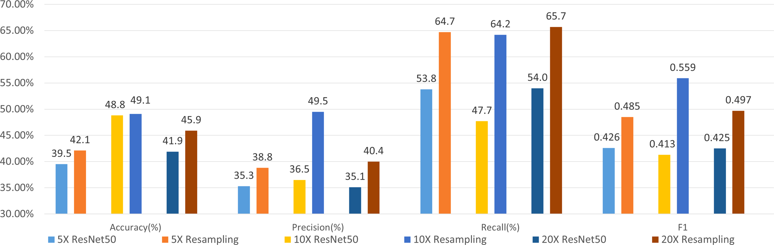 F1 values improve about 6% with patch resampling methods for all the resolutions. In addition, the highest accuracy and F1 value are all achieved at 10×, which indicates that patch size and tissue texture make a good compromise at 10×.
