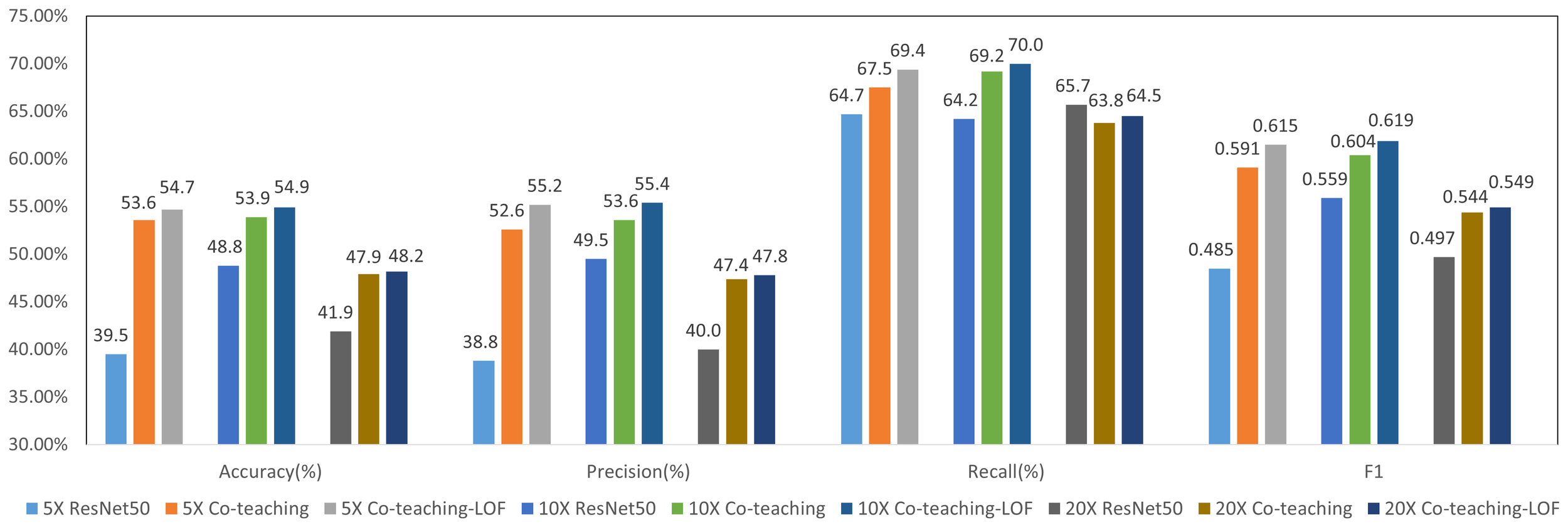We selected the model from Co-teaching with the higher F1 value at each resolution. Features before classification layer were input into LOF-Denoising for patch filtering for all molecular types. We supposed Si is the number of normal patches of the ith molecular type and there were features in total. These features in co-teaching were used for statistical classification of output logits, the number of which is limited to 2,000. The experimental results are shown in Figure 6, which shows that LOF after co-teaching can further improve the metrics since more noise patches are filtered out. We select 10× resolution in the following experiments.