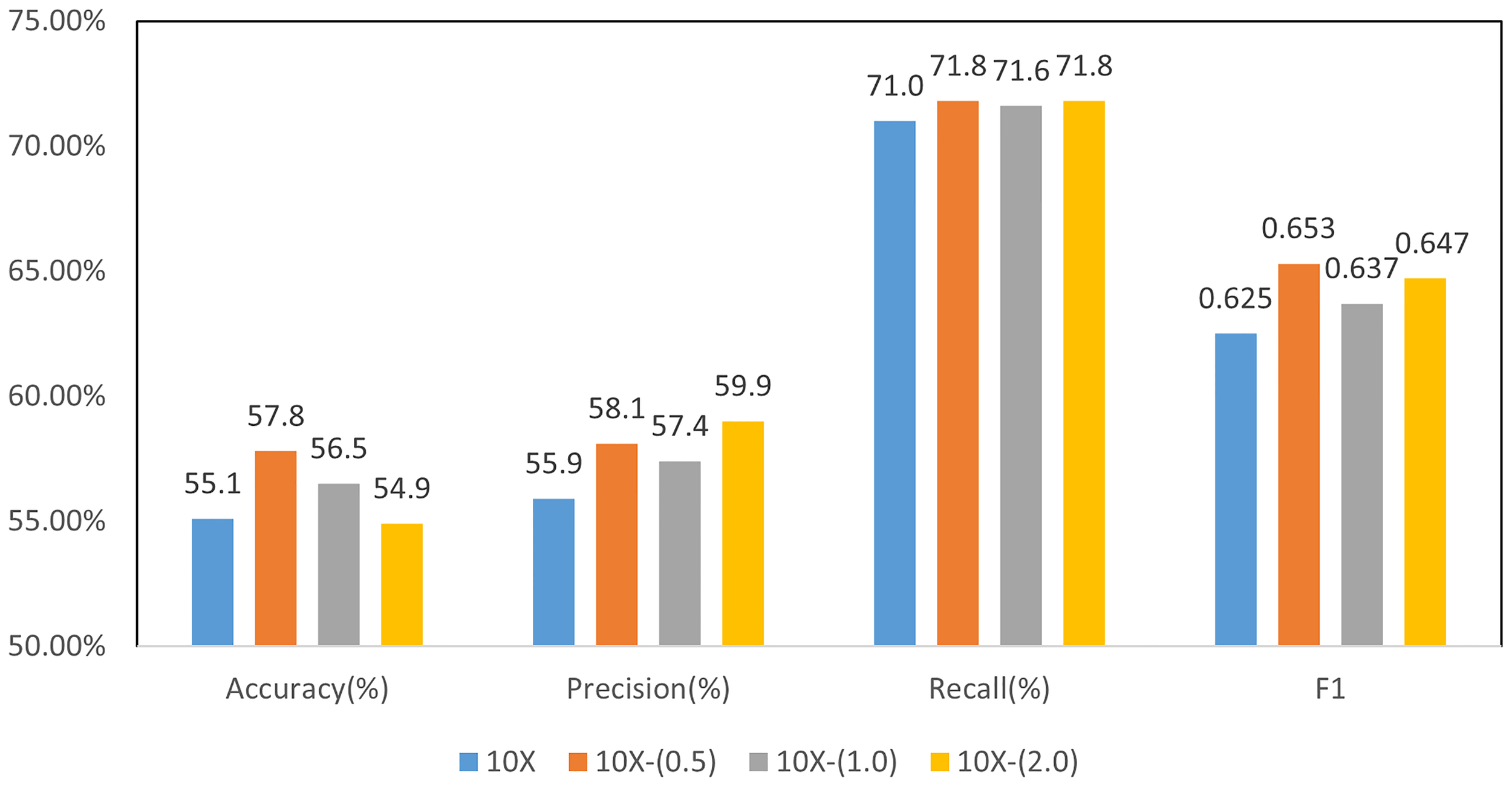 When 0 ≤ α ≤ 1, the influence of the second stage on the model parameters is weakened. When α = 0, the second stage of training does not affect the model. When α > 1, the influence of the second stage is enhanced. We set the value to 0.5, 1.0, and 2.0, respectively, to evaluate the effectiveness of global loss constraint in the second stage of training.