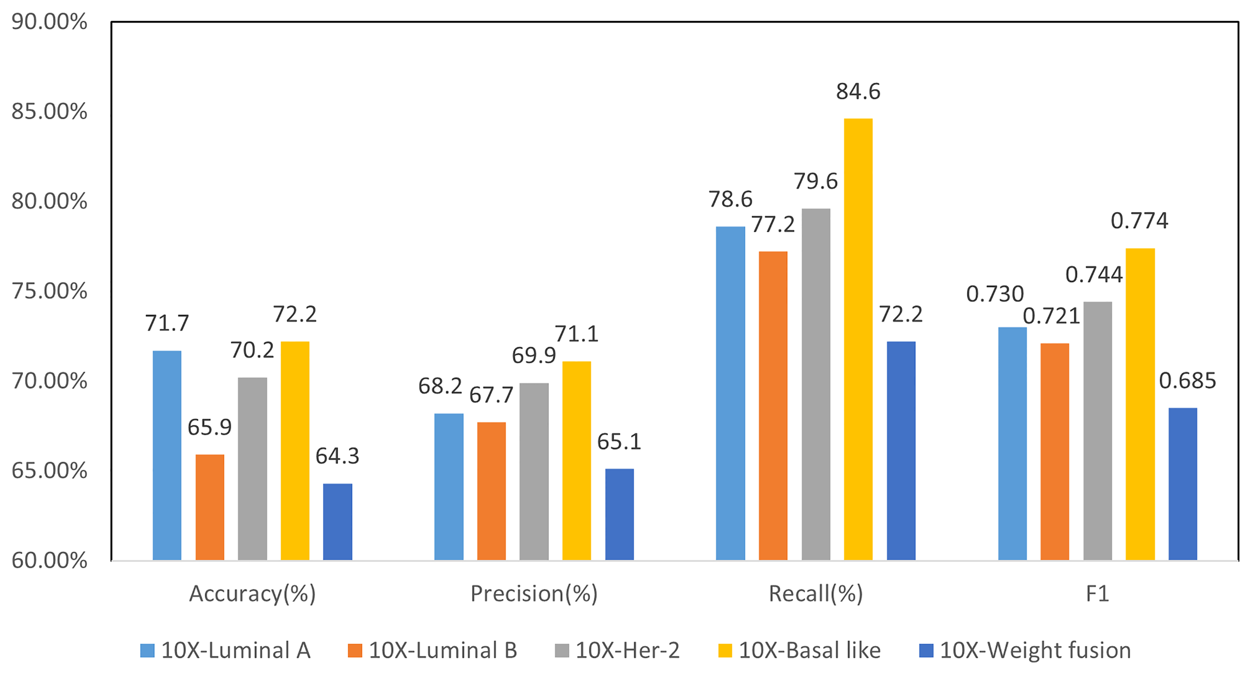 Apart from the four-class classification model, to further improve the performance of molecular subtype classification, we also tried binary classification models for each molecular subtype. Finally, a weighted fusion method is adopted to accomplish the final four-type classification.