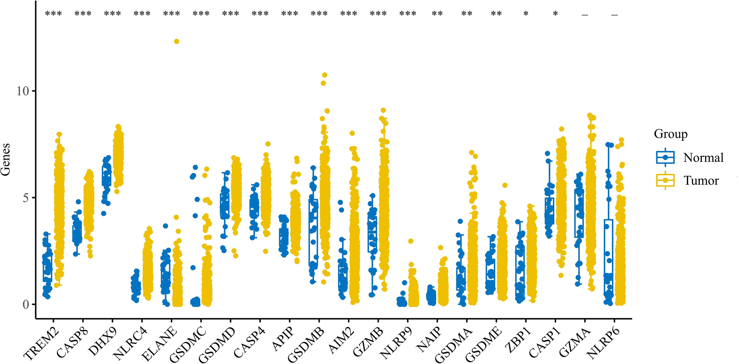 We performed bulk expression analysis obtained and observed the expression of pyroptosis-related genes in gastric cancer (n = 375) and paracancerous tissue (n = 32). Most of the pyroptosis-related genes were upregulated in gastric cancer. See Figure 1.