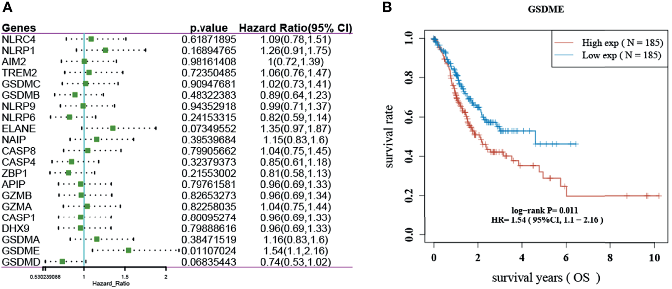 Prognosis of pyroptosis-related genes in gastric cancer. (A) Forest plot showing the OS prognosis of pyroptosis-related genes in gastric cancer. (B) KM survival curve of GSDME in gastric cancer.