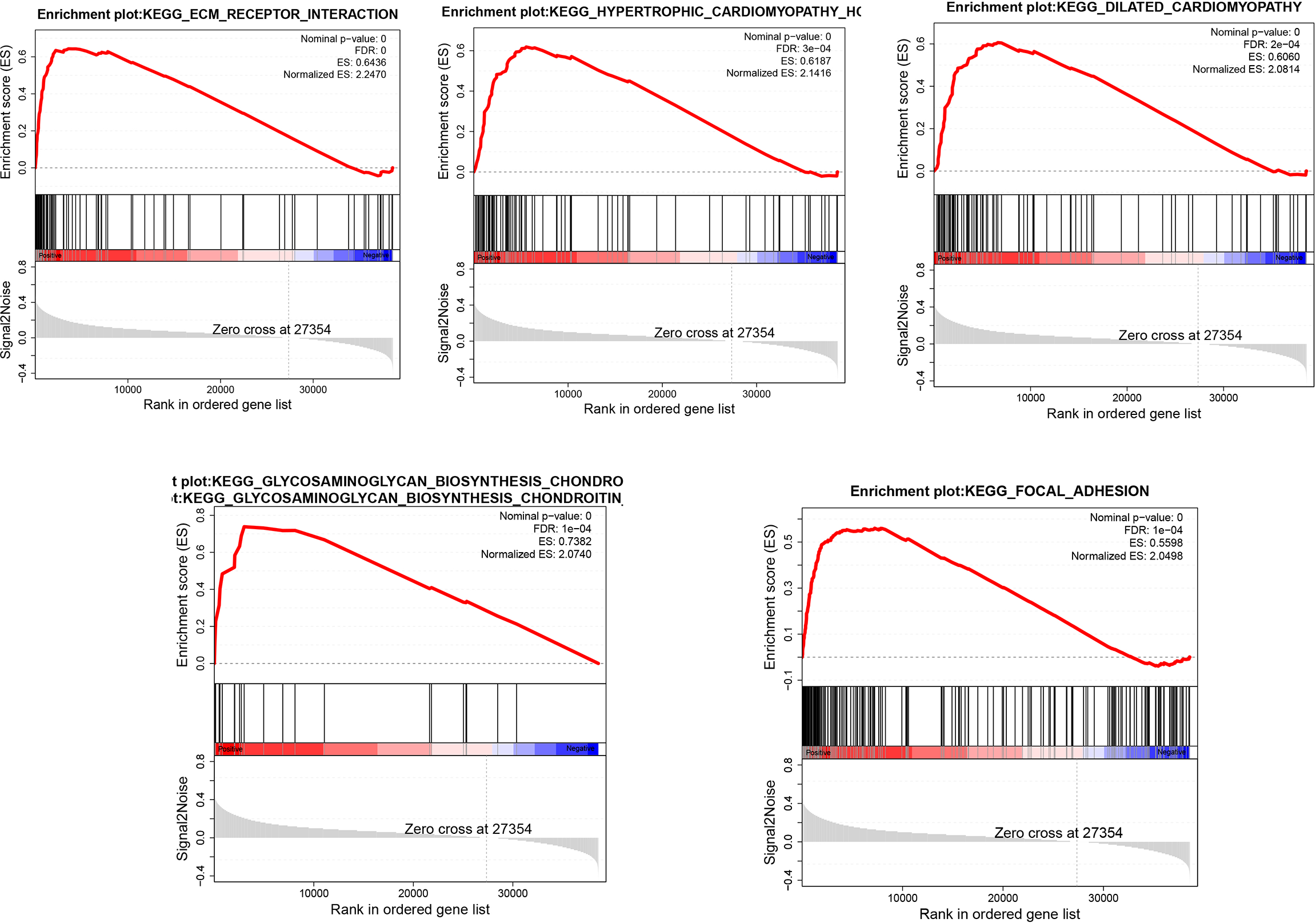 We divided the samples into 2parts according to the median expression levels of GSDME in gastric cancer and then analyzed the biological processes or signaling pathways involved in high GSDME expression in gastric cancer. We only screened the top five-ranked signaling pathways. The analysis revealed that the high expression of GSDME in gastric cancer was found in ECM_RECEPTOR_INTERACTION, HYPERTROPHIC_CARDIOMYOPATHY_ HCM, DILATED_CARDIOMYOPATHY, GLYCOSAMINOGLYCAN_ BIOSYNTHESIS_CHONDROITIN_SULFATE, and FOCAL_ADHESION, which have important roles. See Figure 4.