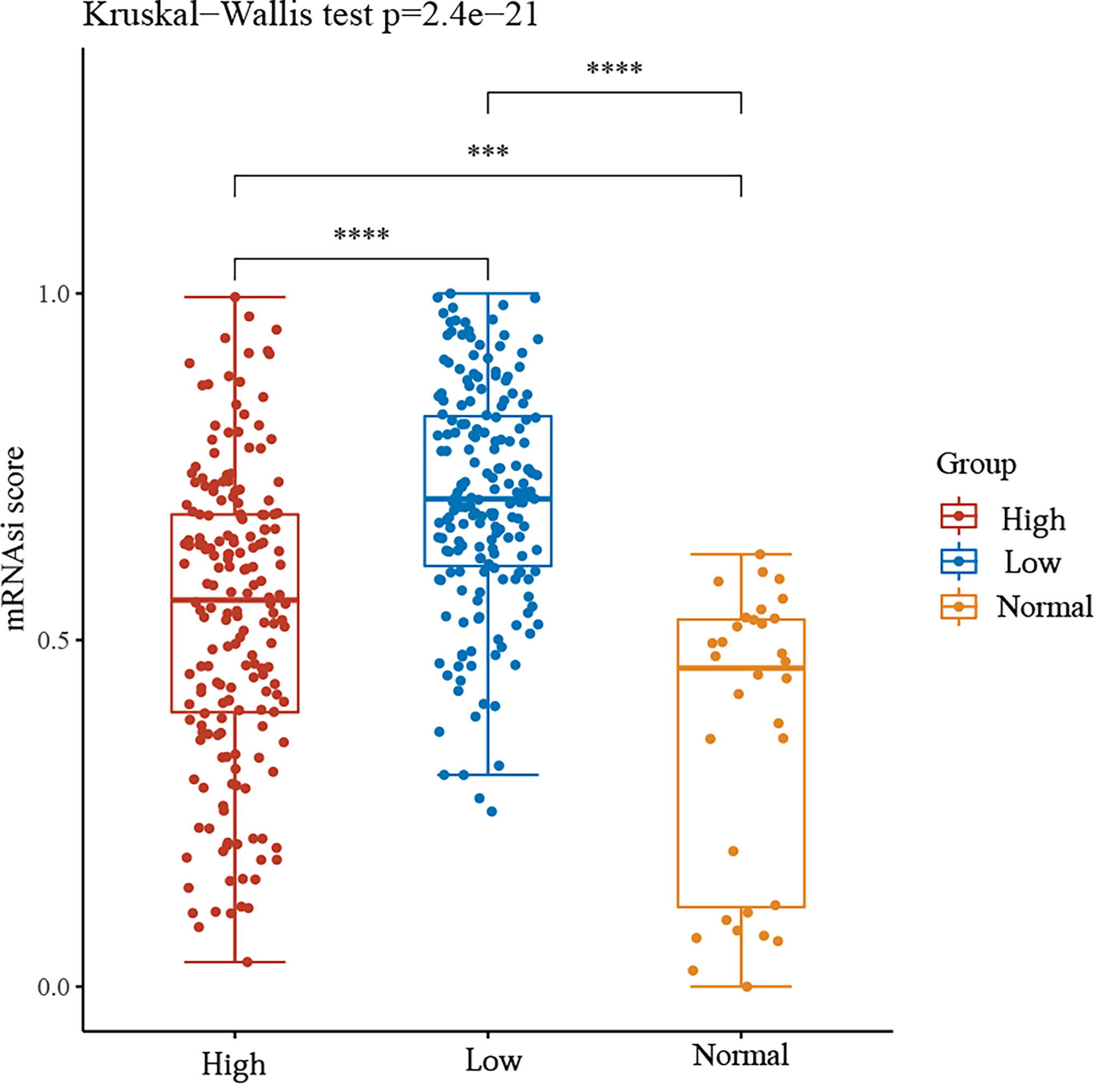 We then divided the group into high and low expression groups based on the median GSDME expression. The mRNAsi scores between the two groups and the normal group were observed. The results showed that the mRNAsi score was significantly higher in the GSDME high expression group compared to the normal group. Surprisingly, the mRNAsi score was again significantly higher in the GSDME low expression group compared to the high expression. This may be a shift in the progression of gastric cancer, but the exact reason for this remains to be explored. See Figure 5.