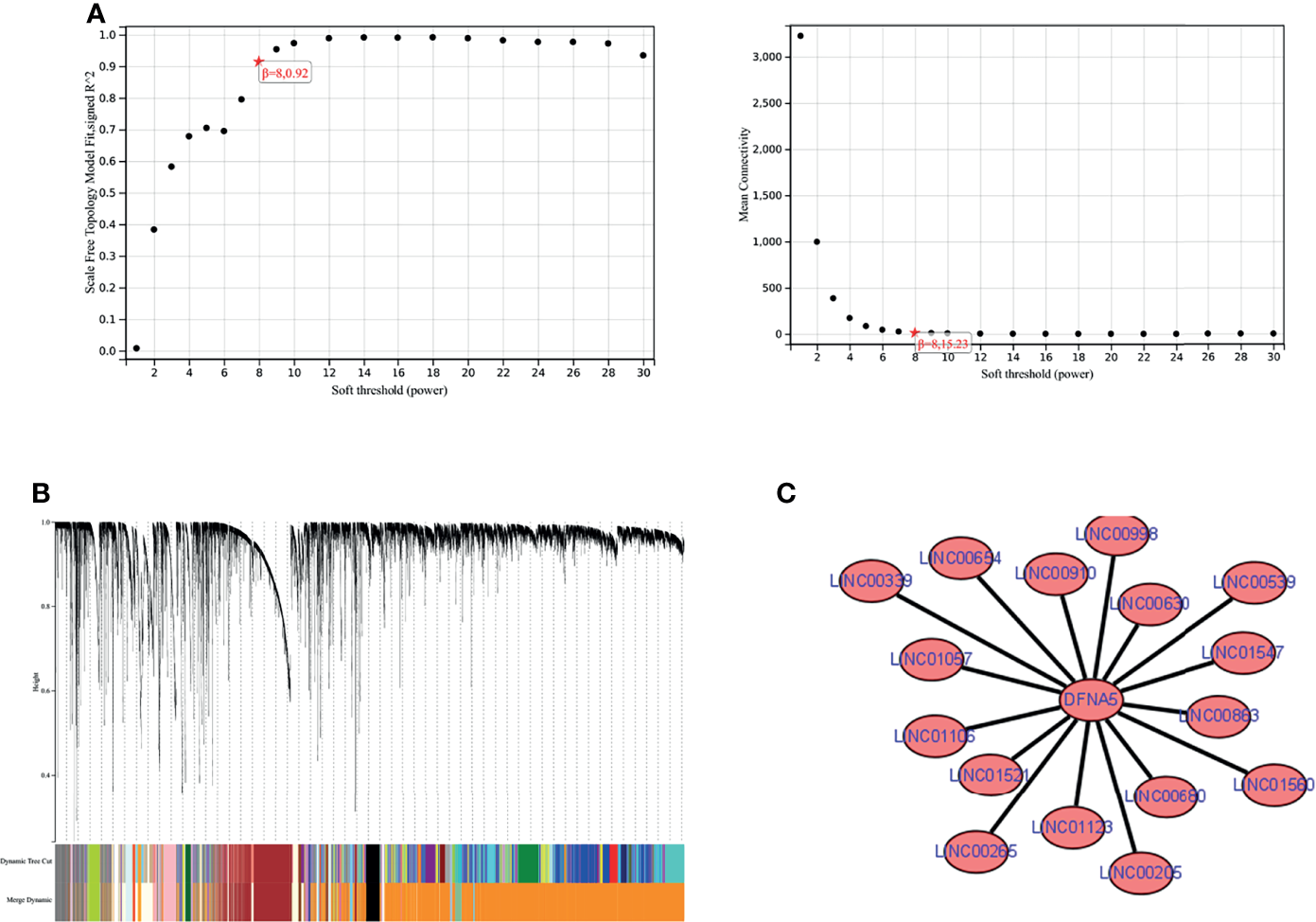 WGCNA analysis. (A) soft threshold determination. (B) gene clustering map. (C) lncRNAs-GSDME interaction network map.