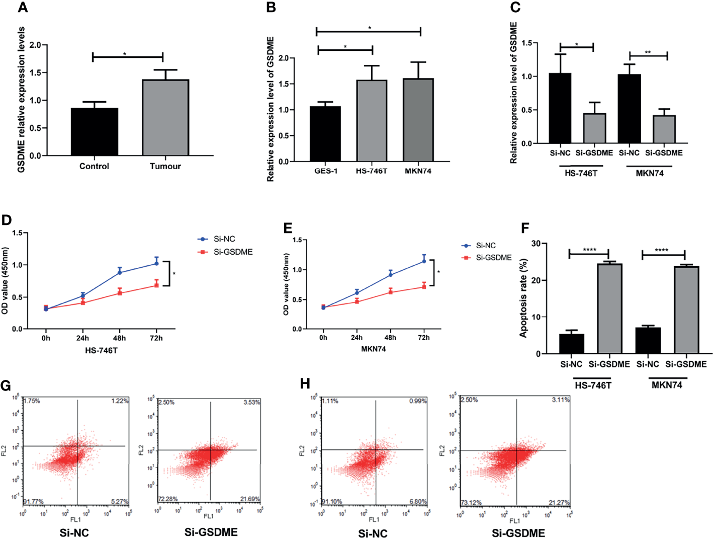 Cells were transferred to six-well plates at 2 x 10 five cells/well and incubated overnight at 37°C in an incubator. Si-NC and Si-GSDME were transfected with HS-746T and MKN74 cells using a Lipofectamine 2000 kit according to the kit instructions into DMEM containing 10% FBS and incubated for 6 h after transfection.