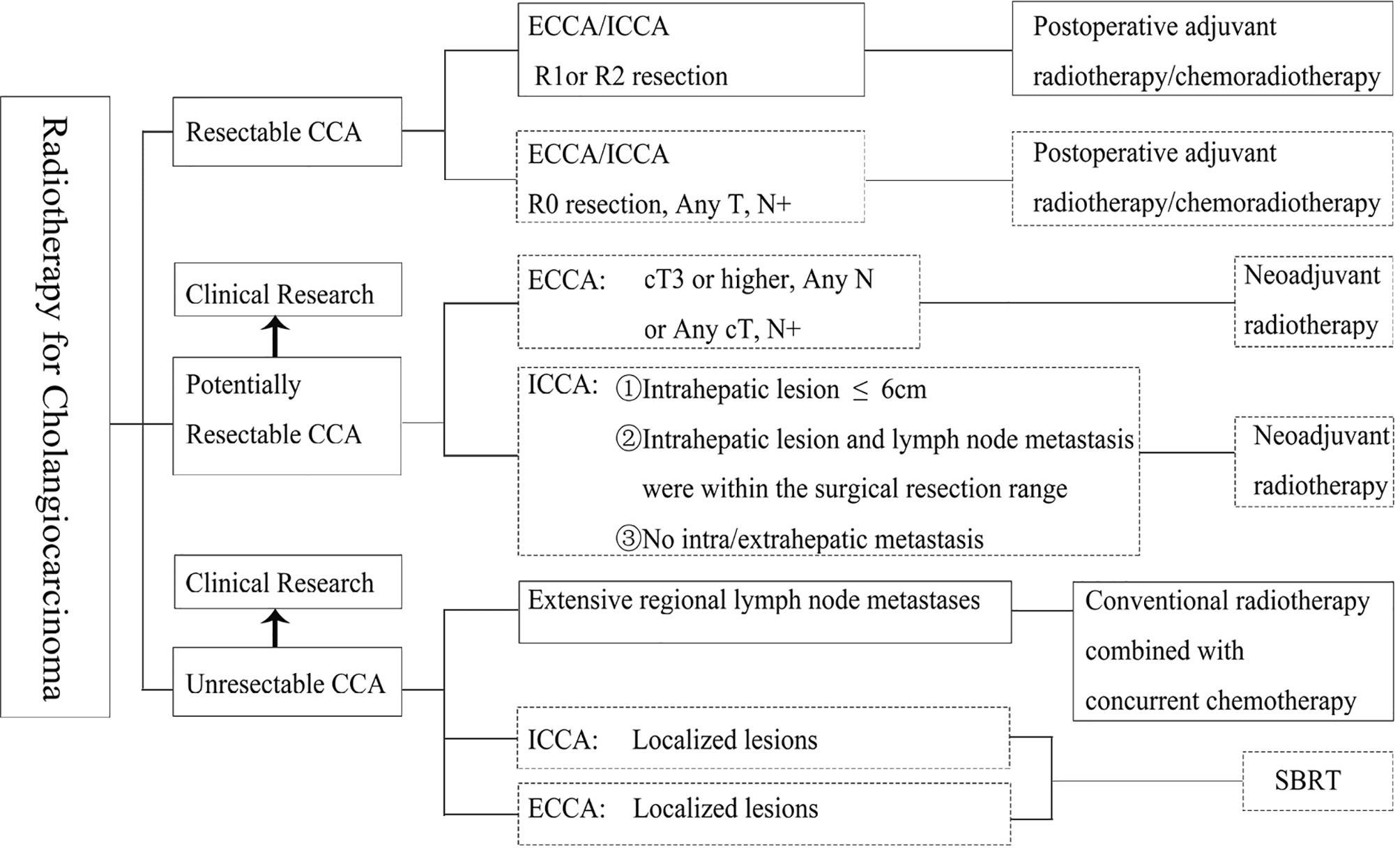 Principles of radiation in different cholangiocarcinoma stages. ECCA, extrahepatic cholangiocarcinoma; ICCA, intrahepatic cholangiocarcinoma; R0, no cancer at resection margins; R1, microscopic residual cancer; R2, macroscopic residual cancer; SBRT, stereotactic body radiation therapy. The boxes with solid lines indicate Category I or II recommendations and the boxes with dotted lines indicate Category III recommendations.