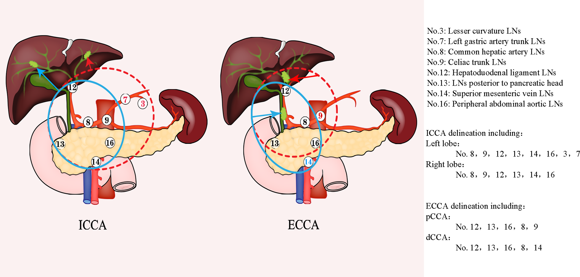 Lymph node delineation in cholangiocarcinoma. The left figure shows the range of LNS with high risk in ICCA, the red dotted line represents the delineation range of LNS for left ICCA, and the blue line represents corresponding LNS for right ICCA; The right figure represents the corresponding the range of LNS with high risk for ECCA, the red dotted line represents the corresponding LNS area for pCCA, and the blue line represents the corresponding lymph node drainage area of dCCA. ECCA, extrahepatic cholangiocarcinoma; ICCA, intrahepatic cholangiocarcinoma; pCCA, perihilar cholangiocarcinoma; dCCA, distal cholangiocarcinoma; LNS, lymph node stations.