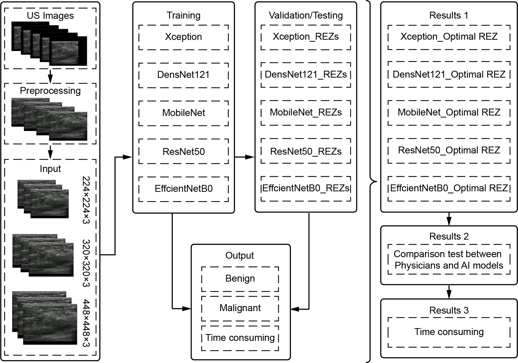 Therefore, this study performed extensive cross-comparison of model_REZ and generalization tests: 1. Lightweight models (MobileNet, Xception and EfficientNetB0) and heavyweight models (DensNet121, and ResNet50). 2. Three dominant REZs (224 × 224 pixels, 320 × 320 pixels and 448×448 pixels). The above scientific hypotheses were verified by cross-comparisons: the diagnostic accuracy of the AI combinations (model_REZ) based on breast images is higher than senior physicians.