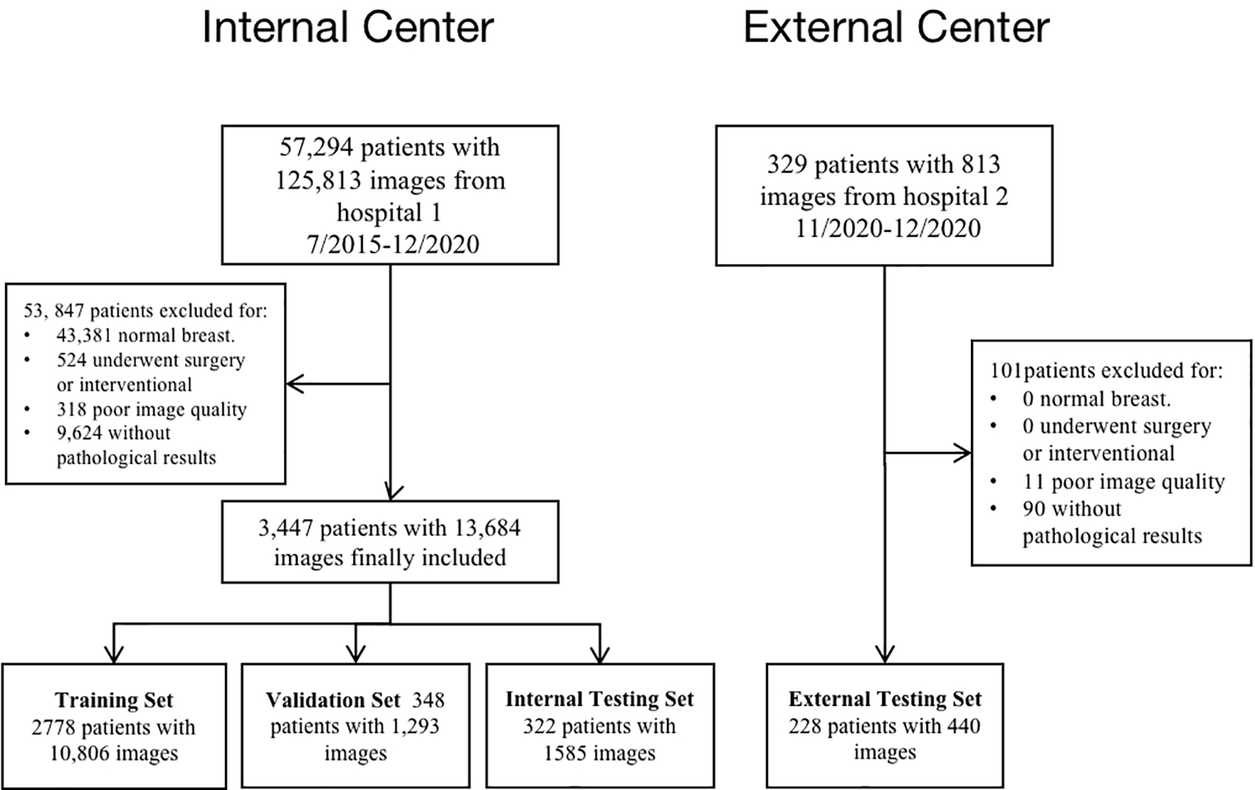 A final total of 13,684 grayscale US images from 3,447 female patients were included according to the inclusion and exclusion criteria from July 2015 to December 2020. On average, 4 valid grayscale US images were available for each patient. Of these, 2457 were benign tumors (9102 images) and 990 were malignant tumors (4582 images). The training set, validation set, and internal test set are 10,806, 1,293, and 1,585 images, respectively, according to the 8:1:1 of the number of patients. The external testing set are 440 images respectively. Table 1 show the distribution of baseline characteristics of the collected patients. Appendix Tables 1, 2 demonstrate the distribution of the study sample across trials. The flow chart is shown in Figure 2.