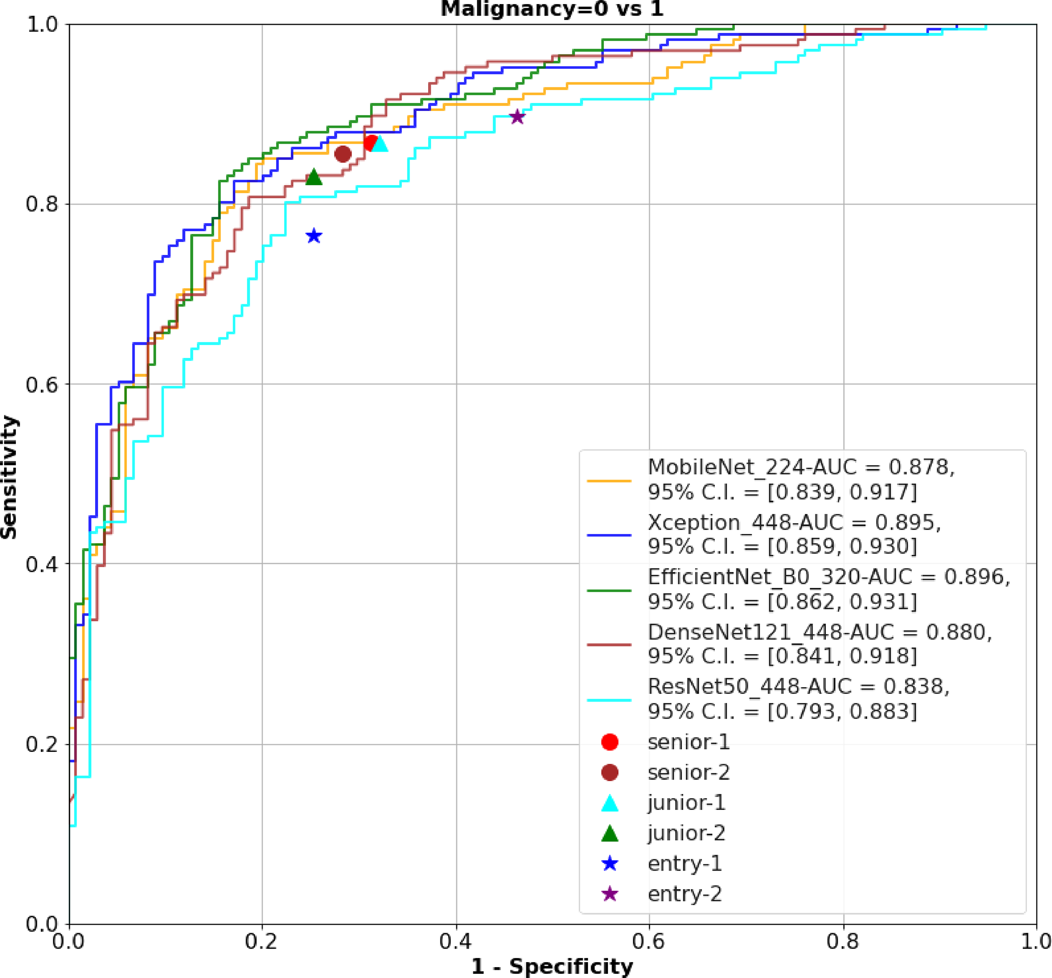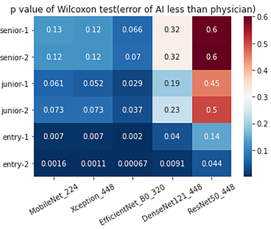 2. MobileNet_224, EfficientNetB0_320 and Xception_448 can achieve equivalent performance as senior physicians.
