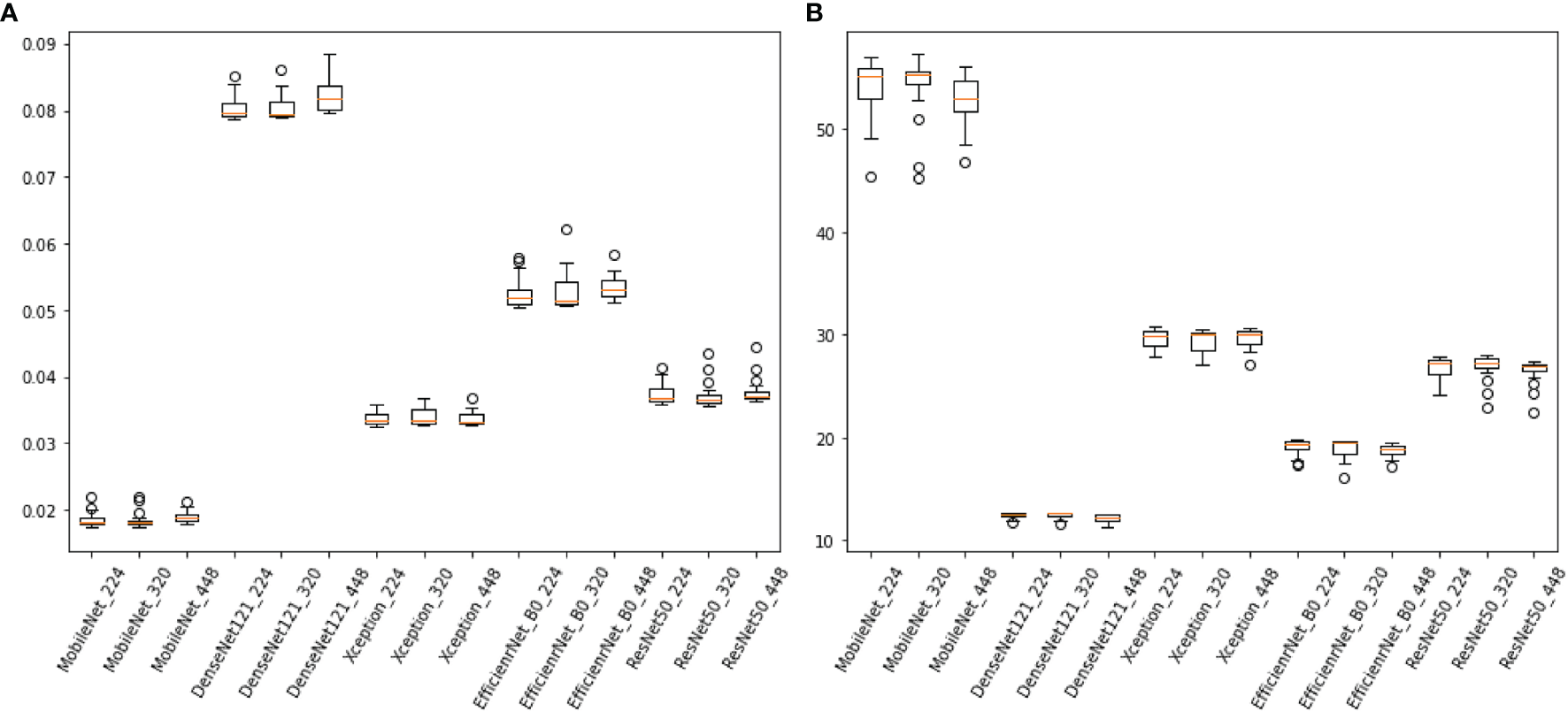 3. The lightweight model, such as MobileNet_224, is more dominant in small REZ images, which also indicates that it is suitable for mobile application scenarios.