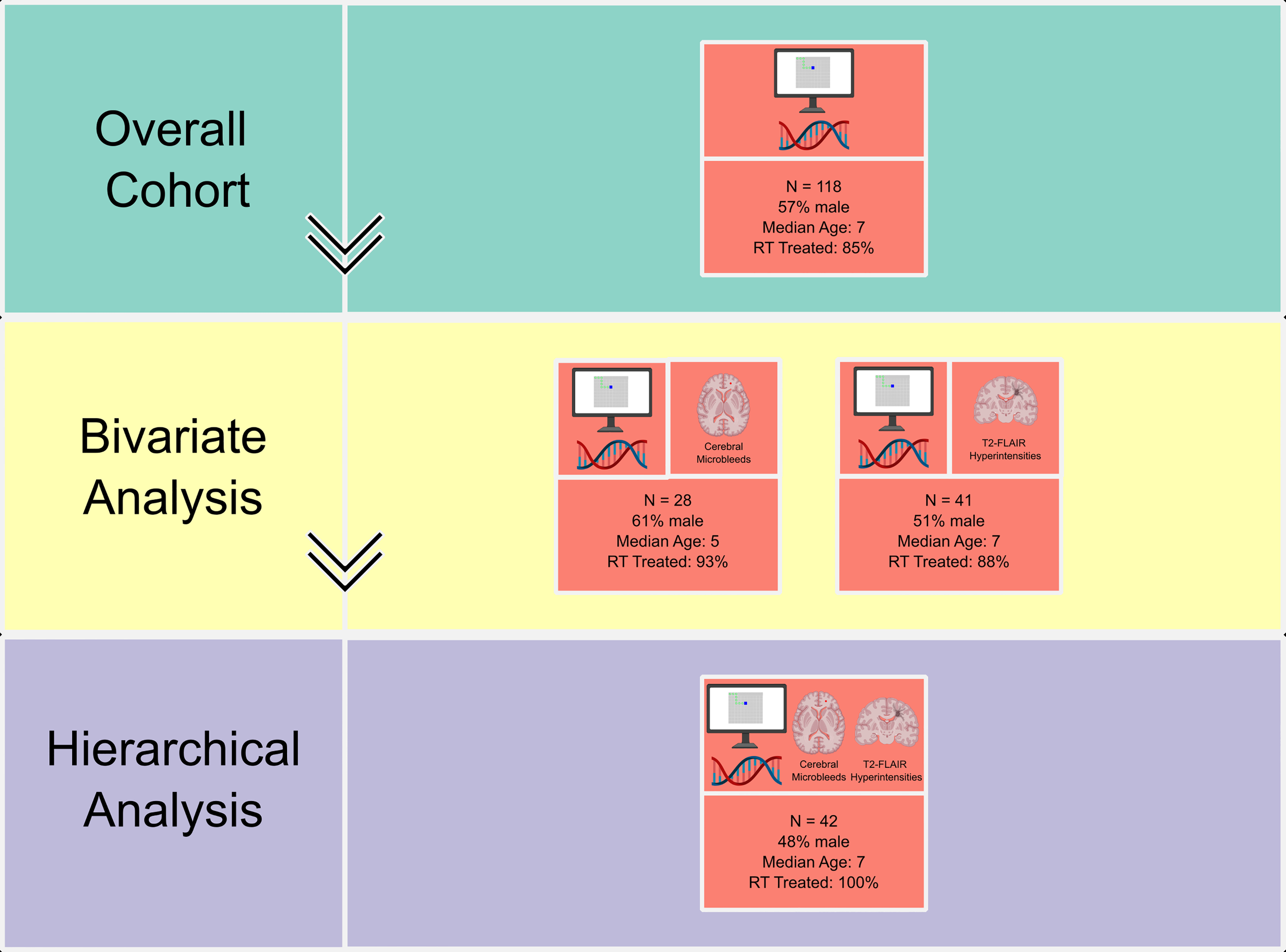 Diagram of modalities investigated and bivariate and multivariate analyses with individual subcohort size and characteristics. Diagram details delineate data type at each level of analysis: neurocognitive assessments (computer screen), candidate gene sequencing (double helix), and imaging (CMBs as axial view, FLAIR WML as coronal view). RT, radiation therapy. Created with BioRender.com.