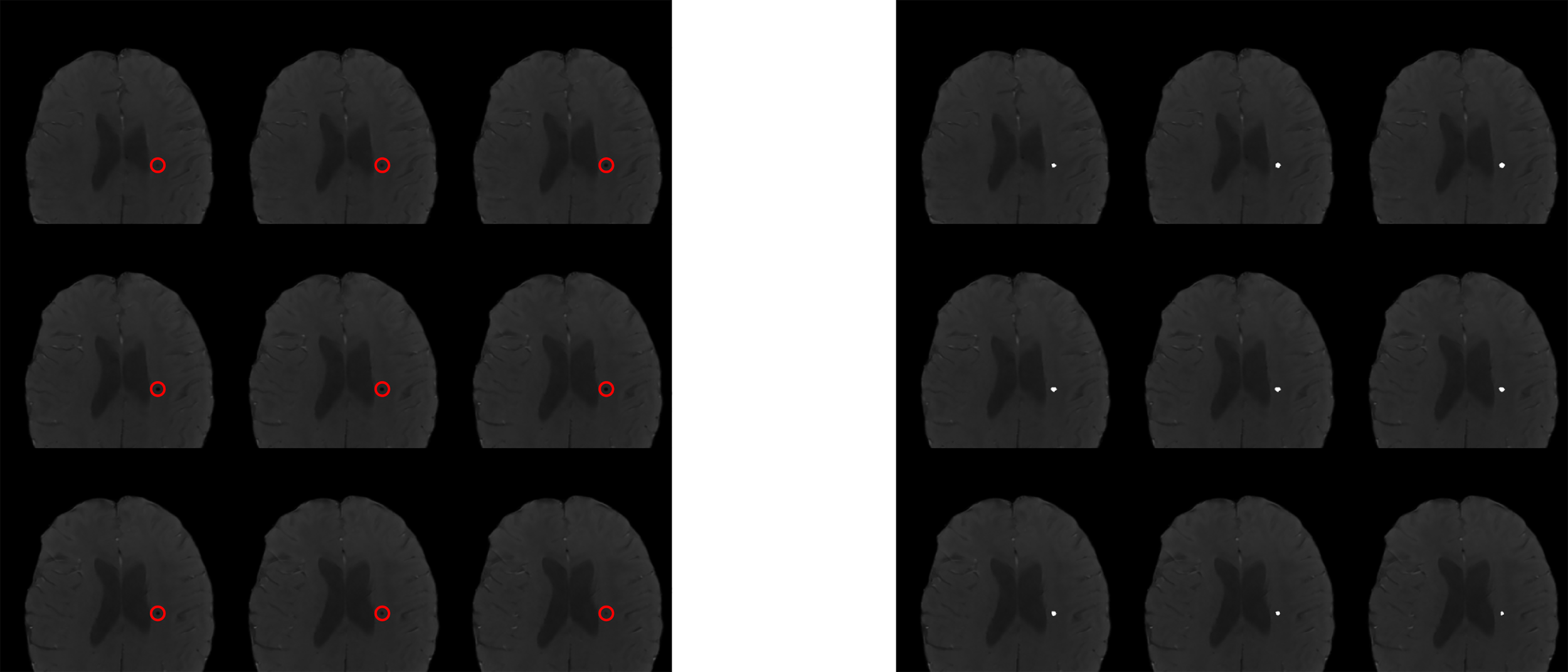 Visual representation of CMB analysis. Imaging inclusive of semi-automated lesion segmentation iron-sensitive sequence analysis. Left panel shows sequence without segmentation label with manually insertion of red circle outlining area of known cerebral microbleed. Right panel displays with semi-automated insertion of white circle overlying area of cerebral microbleed identified on segmentation.