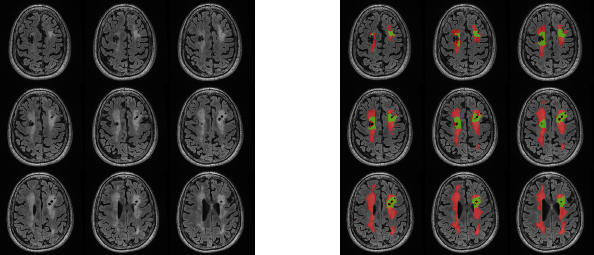 Visual representation of WML analysis. Imaging inclusive of manual T2-FLAIR white matter lesion segmentations with RT-induced (red) and non-RT-induced (green) labeling. RT, radiation therapy.