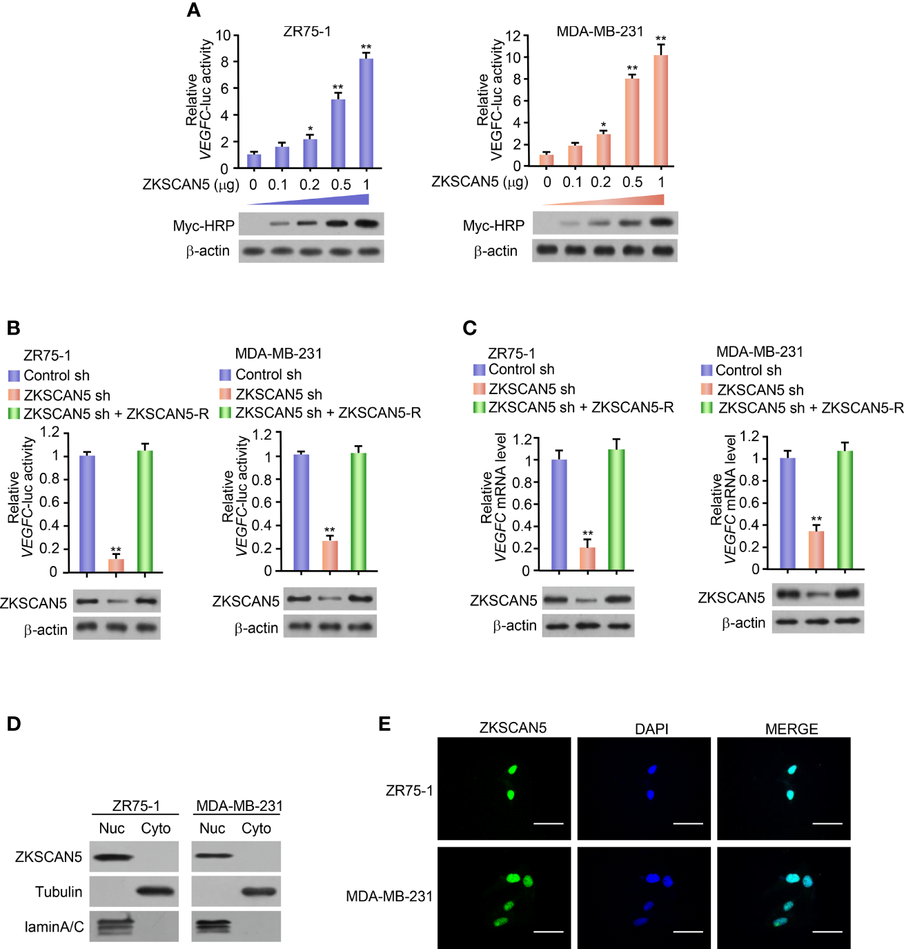 ZKSCAN5 regulates the expression of VEGFC in breast cancer cells. (A) Luciferase reporter genes were determined in ZR75-1 and MDA-MB-231 breast cancer cells co-transfected with different concentrations of VEGFC reporter and myc-ZKSCAN5. A representative immunoblot showed the expression of myc-HRP. β-Actin was used as a control for loading. All values shown are expressed as the average value ± SD obtained from three independent experiments. *p < 0.05, **p < 0.01, and empty vector. (B) Luciferase reporter gene detection in ZR75-1 and MDA-MB-231 breast cancer cells co-transfected with VEGFC-Luc and ZKSCAN5 shRNA, VEGFC-Luc and control shRNA, or VEGFC-Luc and ZKSCAN5 shRNA plus shRNA-resistant ZKSCAN5 (ZKSCAN5-R). The representative Western blot shows ZKSCAN5 expression. Among them, β-actin was used as the loading control. (C) Real-time RT-PCR was used to analyse the VEGFC expression in ZR75-1 and MDA-MB-231 cells, which were transfected with ZKSCAN5 shRNA, control shRNA, or ZKSCAN5 shRNA plus shRNA-resistant ZKSCAN5 (ZKSCAN5-R). The representative Western blot further showed the expression of ZKSCAN5. Data shown are the mean ± SD of triplicate measurements from experiments that have been repeated three times with similar results (B, C). **p < 0.01 versus control shRNA. (D) Cytoplasmic and nuclear ZKSCAN5 protein levels in two types of breast cancer cell lines, ZR75-1 and MDA-MB-231. Tubulin was used as the cytoplasmic control, and lamin A/C was used as the nuclear protein-loading control. (E) Immunofluorescence images of ZKSCAN5 cellular localisation in green, and nuclei stained in blue (DAPI).