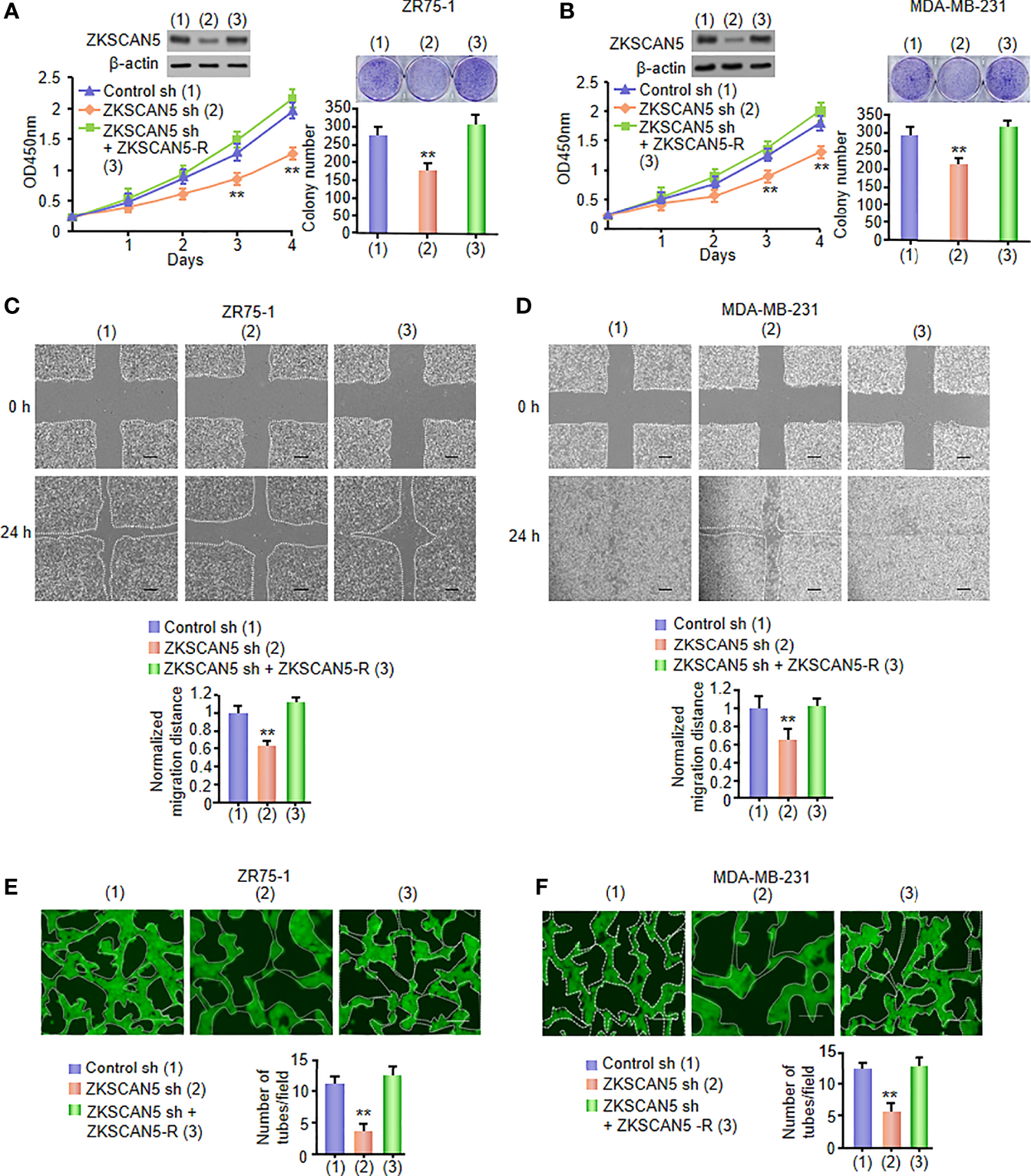 Cancer cell-secreted VEGFC markedly enhanced the proliferation and migration of lymphocyte endothelial cells. Because ZKSCAN5 improved the secretion of VEGFC by breast cancer cells, the effects of the conditioned medium on HLEC proliferation and migration were investigated in ZKSCAN5 knockdown stable cell lines. The ZKSCAN5 knockdown ZR75-1 or MDA-MB-231 cell-conditioned medium decreased HLEC proliferation. The conditioned medium from these cells re-expressing ZKSCAN5 could rescue these effects (Figures 2A, B). A similar tendency was also detected in HLEC migration analysis (Figures 2C, D).