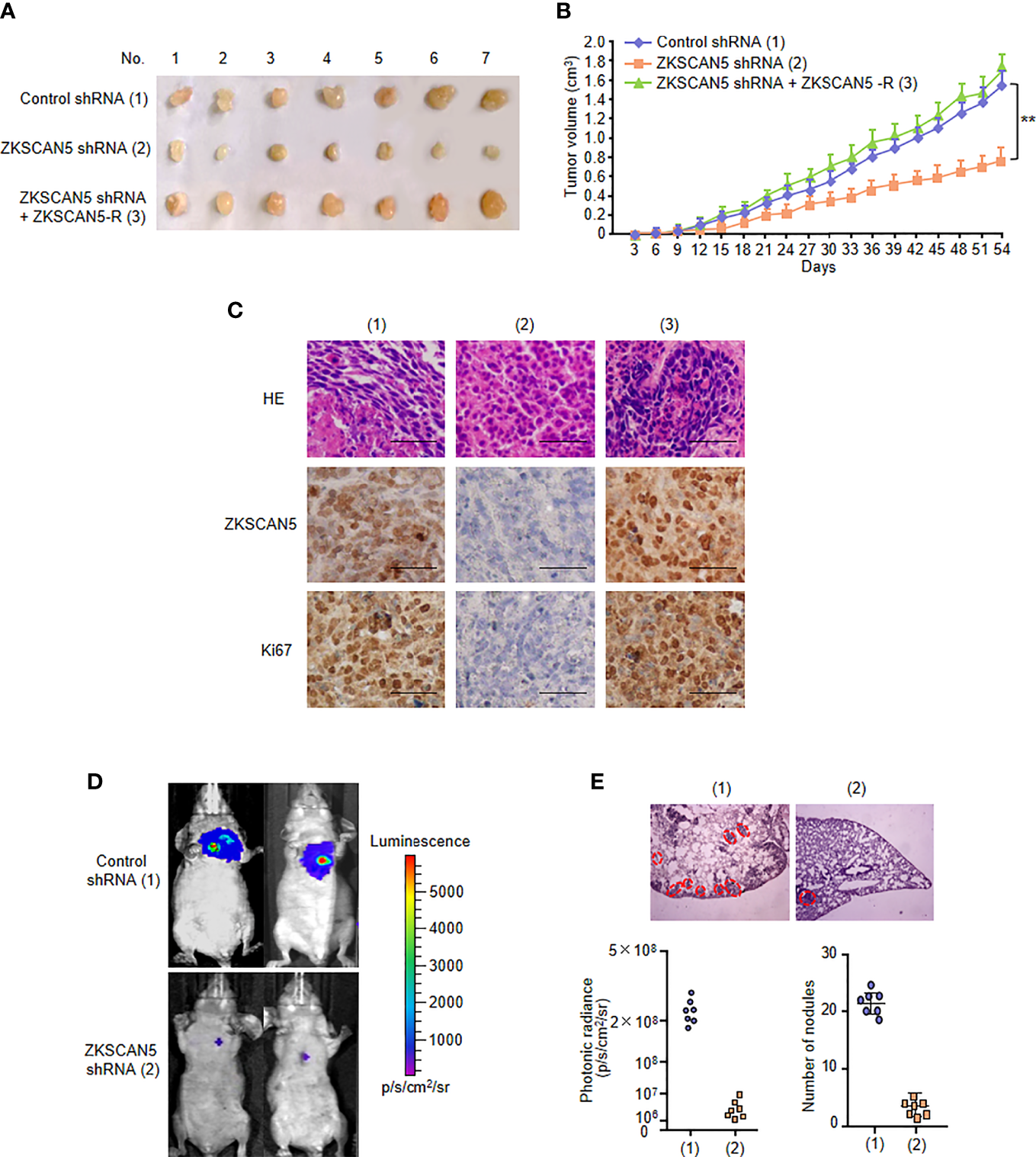 ZKSCAN5 regulates the growth of breast cancer tumours and lung metastasis in vivo. (A, B) ZR75-1 cells stably infected with the lentivirus carrying the indicated constructs were injected subcutaneously into the nude mice (n = 7 per group). The tumour volume was measured every 3 days, and the growth curve was plotted (B). (C) Representative IHC staining of ZKSCAN5 and Ki67 and H&E staining images of tumours resected from nude mice. Scale bar, 50 µm. (D) MDA-MB-231 cells stably expressing the constructs were injected through the tail vein to construct a breast cancer cell metastasis model in nude mice (n = 7 per group). (E) Anatomical and histological analyses of representative lung metastases were carried out. The number of tumour tubercles was determined under an anatomical microscope. Symbols represent individual mice. **p < 0.01 versus the corresponding control.