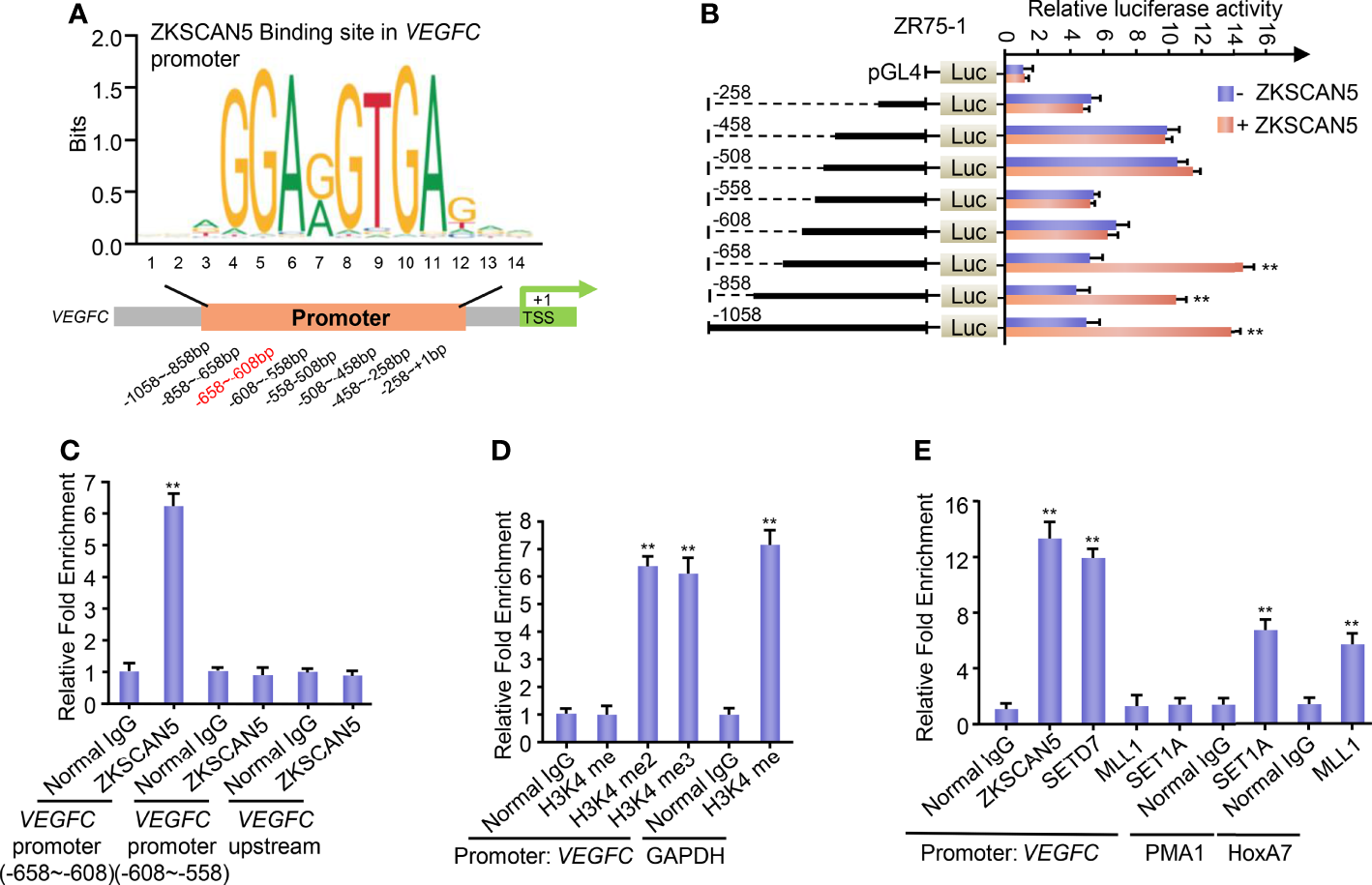 (A) Conserved binding sequences of the transcription factor ZKSCAN5 (JASPAR: http://jaspar.genereg.net/) and its binding sites to the VEGFC promoter. (B) Luciferase activity of various VEGFC promoter constructs in ZR75-1 cells transfected with ZKSCAN5 or empty vector. Data shown are the mean ± SD of triplicate measurements and were repeated three times with similar results. **p < 0.01 versus empty vector with corresponding promoter reporter. (C) ChIP analysis of the occupancy of ZKSCAN5 on the putative ZKSCAN5-binding sites of the VEGFC promoter in ZR75-1 cells. (D) ChIP analysis of the occupancy of H3K4me, H3K4me2, and H3K4me3 on the VEGFC promoter in ZR75-1 cells. The GAPDH promoter has the function of H3K4me2- and H3K4me3-positive control. (E) ChIP analysis of the occupancy of ZKSCAN5 and different histone methyltransferases on the VEGFC promoter in ZR75-1 cells. Positive controls of SET1 and MLL1 were promoters of PMA1 and HoxA7, respectively.