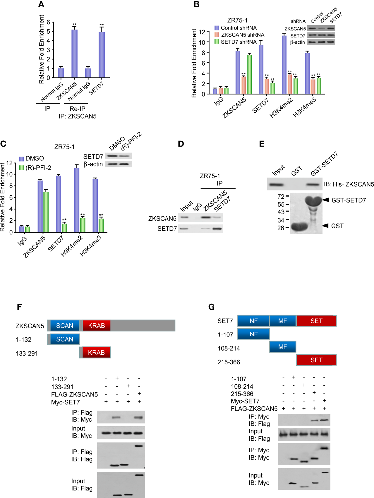 ZKSCAN5 and SETD7 constructed a complex on the −658- to −608-bp region of the VEGFC promoter. (A) Re-ChIP analysis of the occupancy of ZKSCAN5 and SETD7 on the VEGFC promoter (−658 to −608 bp) in ZR75-1 cells. (B) ChIP analysis of ZR75-1 cells stably infected with lentivirus carrying ZKSCAN5 shRNA or SETD7 shRNA on VEGFC promoter (−658 to −608 bp) with the indicated antibodies. Western blot revealed the knockdown effects of ZKSCAN5 and SETD7. **p < 0.01 versus corresponding control shRNA. (C) ChIP analysis using the SETD7 antibody in ZR75-1 cells treated with DMSO or (R)-PFI-2 on the VEGFC promoter (−658 to −608 bp). (D) Reciprocal coimmunoprecipitation analysis of endogenous interactions among ZKSCAN5 and SETD7. (E) GST pull-down analysis of direct interactions between ZKSCAN5 and SETD7. Purified His-tagged ZKSCAN5 and GST-SETD7 or GST was used. (F) Mapping of the interaction region of SET7 in ZKSCAN5. HEK293T cells were co-transfected with MYC-tagged SET7 and FLAG-tagged ZKSCAN5 or its deletion mutants. Anti-FLAG immunoprecipitation was used to precipitate cell lysates, followed by immunoblotting with the specified antibody. The schematic diagram shows ZKSCAN5 and its deletion mutants. (G) The mapping highlights the interaction region of ZKSCAN5 in SET7. HEK293T cells were co-transfected with MYC-tagged ZKSCAN5 and FLAG-tagged SET7 or its deletion mutants. Immunoprecipitation of the cell lysate was analysed in (A). The schematic diagram shows SET7 and its deletion mutants; MF, middle region fragment; SET, SET domain-containing fragment. All values shown are the mean ± SD of triplicate measurements from experiments that have been repeated three times with similar results.