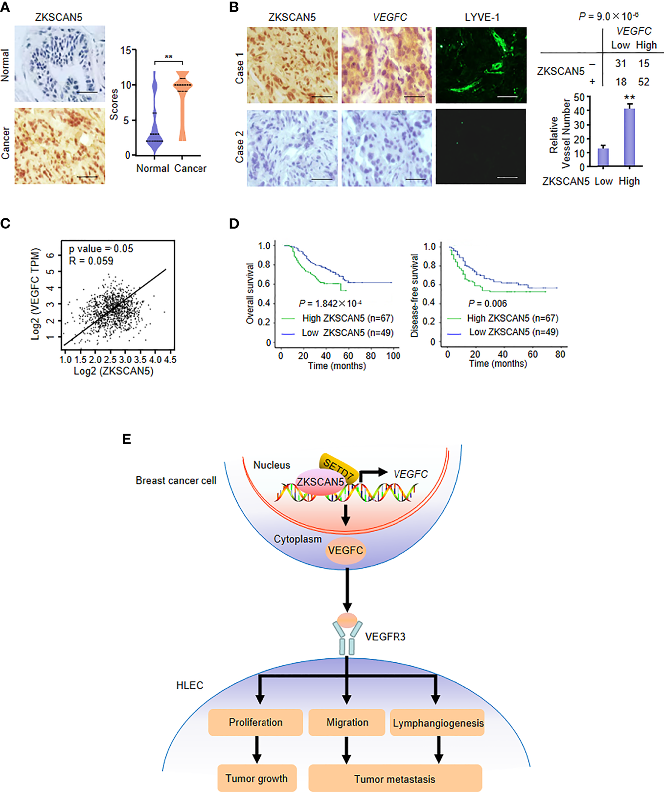 ZKSCAN5 is a prognostic marker of breast cancer and is positively correlated with VEGFC expression. (A) Representative immunohistochemical staining of ZKSCAN5 in human cancerous breast tissues and adjacent normal breast tissues. Scale bar: 25 μm. ZKSCAN5 expression scores were plotted and compared (Mann–Whitney U test). (B) Representative immunohistochemical staining of ZKSCAN5 in human breast cancer samples. Scale bar: 25 μm. To quantify lymphatic microvessel density, images were obtained from eight regions of each tissue to calculate the number of vessels more accurately. The correlation of ZKSCAN5 with VEGFC expression or lymph microvessel number (positive LYVE-1 staining) is shown. The p value was generated using Pearson’s χ2 test (ZKSCAN5 and VEGFC) and the Wilcoxon rank-sum test (LYVE-1). (C) Database analysis showed that ZKSCAN5 expression was positively correlated with VEGFC expression in breast cancer patients. (D) The total survival time (above) and disease-free survival time (below) of patients with breast cancer were estimated by the Kaplan–Meier method. The review samples are represented by the markers on the chart lines. (E) Proposed model for ZKSCAN5 modulation of VEGFC expression as well as its tumour-promoting function. ZKSCAN5 recruited SETD7 into the VEGFC promoter, which promoted the increase of VEGFC transcription and secretion in breast cancer cells. VEGFC is secreted by cancer cells, binding to VEGFR3, promoting proliferation, migration and lymphangiogenesis of HELC. Ultimately, they can lead to tumour growth and metastasis.