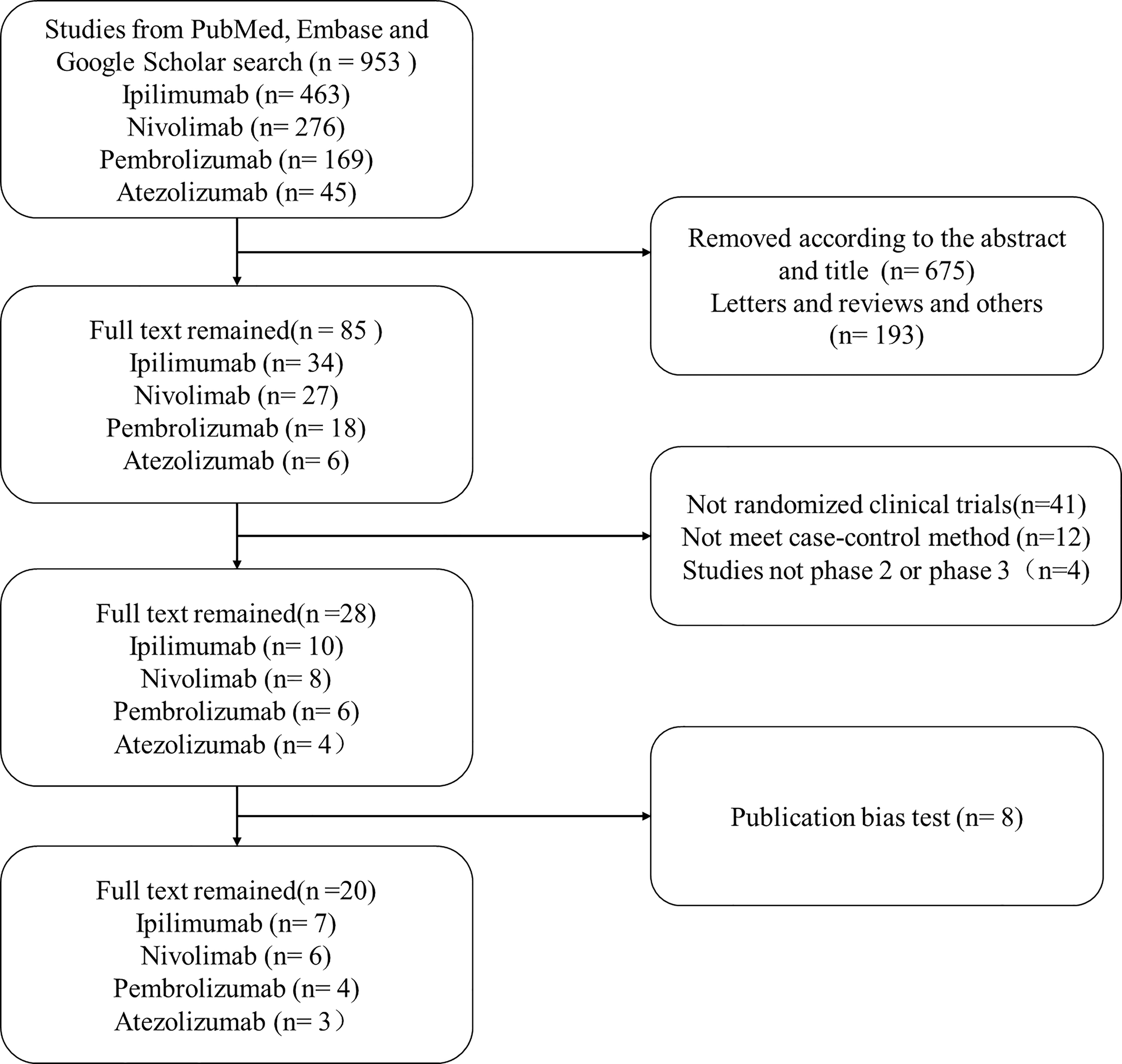 A flowchart for the article selection is shown in Figure 1. Through the search strategy, a total of 953 articles were identified. According to the title and abstract, 675 articles were primarily deleted, 193 articles were removed because they were letters, reviews, and other articles, 41 articles were excluded as they were not randomized clinical trials (RCTs), 12 articles were removed because they did not meet our case–control method, and 4 articles were deleted because studies were not phase 2 or phase 3 RCTs. Then 28 were remained, and 8 articles were removed because of the publication bias test. Finally, 20 articles were left, including 7 ipilimumab articles, 6 nivolumab articles, 4 pembrolizumab articles, and 3 atezolizumab articles, respectively (shown in Table 1). Moreover, the data we extracted from the articles were accessed in clinical trial databases with specific identifiers.