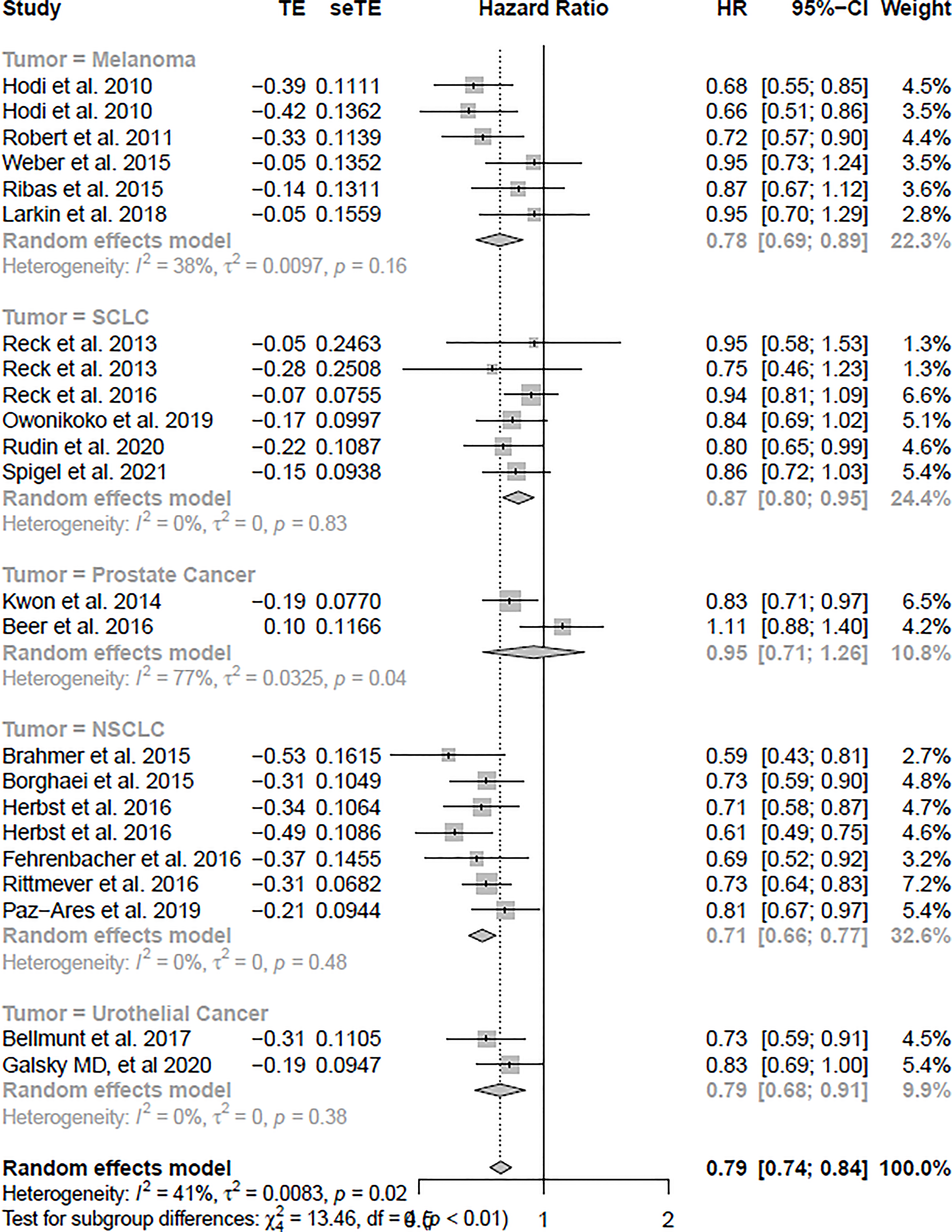 In the OS analysis, the ICIs were associated with substantially ameliorated OS (HR = 0.79, CI = 0.74–0.84), compared with non-ICI therapies. In the subgroup analyses, melanoma, SCLC, NSCLC, and urothelial cancer patients treated with ICIs were associated more with OS compared with non-ICI therapies (HR = 0.78, CI = 0.69–0.89; HR = 0.87, CI = 0.80–0.95; HR = 0.71, CI = 0.66–0.77; HR = 0.79, CI = 0.68–0.91), respectively. However, prostate cancer was not significantly associated with improved OS (HR = 0.95, CI = 0.71–1.26).