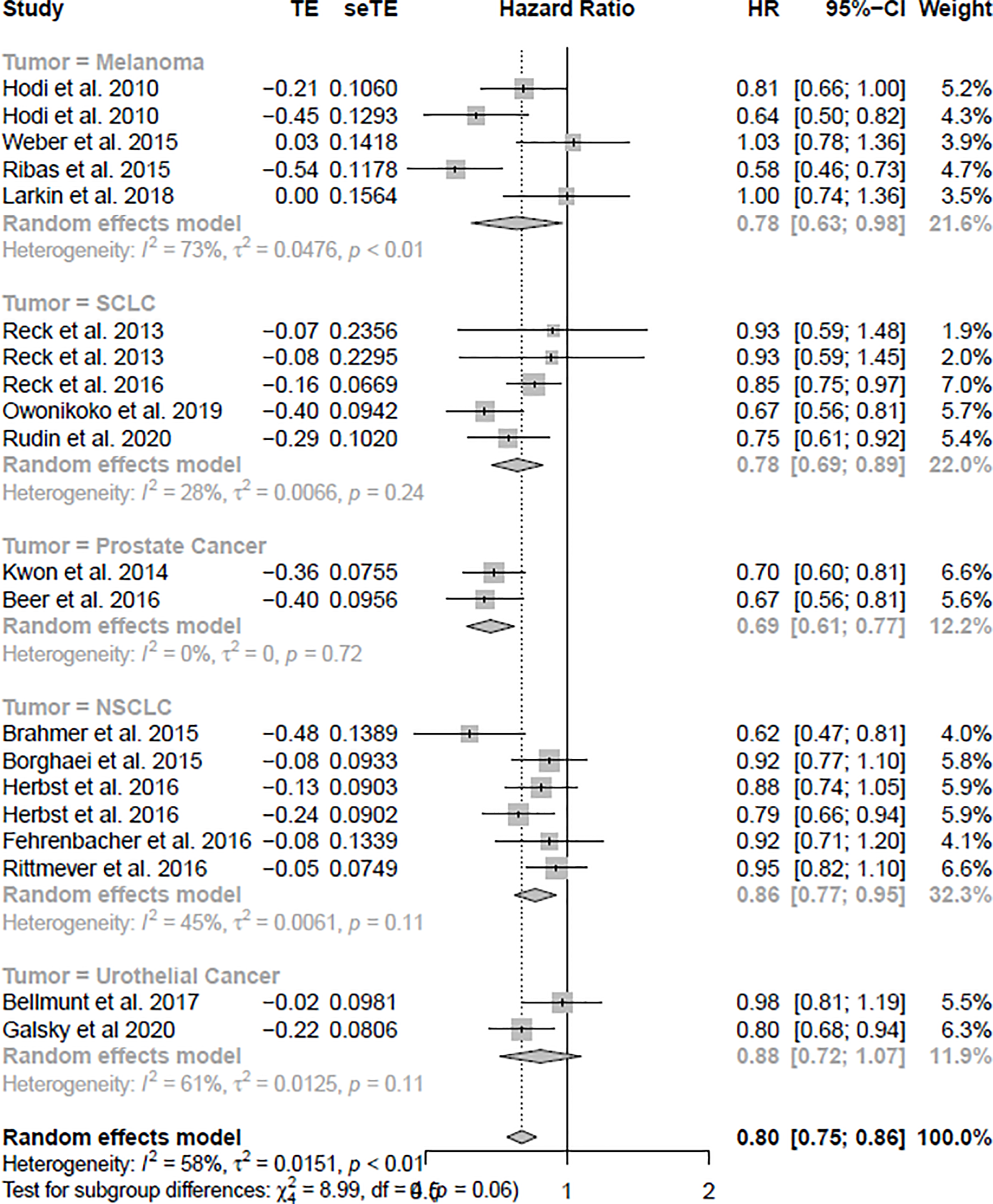 The summary result of heterogeneity is directly shown in Table 2. In the OS group, we found little heterogeneity in total with I2 = 41%, p = 0.02, and we chose to select the random-effect model according to the method we used. In the tumor subgroup heterogeneity test, we did not find obvious significant heterogeneity in the melanoma (I2 = 38%, p = 0.16), SCLC (I2 = 0%, p=0.83), NSCLC (I2 = 0%, p=0.48), and urothelial cancer (I2 = 0%, p = 0.73) subgroups, but a significant heterogeneity was found in the prostate cancer (I2 = 77%, p = 0.04) subgroup. In the PFS group, we also found heterogeneity in total with I2 = 58%, p < 0.01, and we chose to select the random-effect model according to the method we used. In the tumor subgroup heterogeneity test, we did not find obvious significant heterogeneity in the SCLC (I2 = 28%, p = 0.24), NSCLC (I2 = 45%, p = 0.11) and prostate cancer (I2 = 0%, p = 0.72) subgroups, but a significant heterogeneity was found in the melanoma (I2 = 73%, p < 0.01) and urothelial cancer (I2 = 61%, p = 0.11) subgroups.