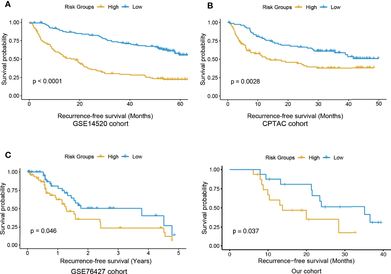 Based on expression profiles of the eight selected genes, we built an Eight-Gene Cox (EGC) model, and HCC patients were stratified into high and low risk groups by the median risk scores (see Materials and Methods). Significant differences in RFS between risk groups were observed in the training cohort (GSE14520) (Figure 2A, log rank test, P < 0.0001). Consistently, in two validation cohorts [CPTAC (Clinical Proteomic Tumor Analysis Consortium) and GSE76427], the RFS in the high-risk group was shorter (Figures 2B, C). Furthermore, we collected 32 snap-frozen HCC tissues, and measured RNA abundance of the eight genes using quantitative real-time PCR (qPCR). Consistently, in this cohort, significantly shorter RFS was observed in the high-risk group, compared with the low-risk group (Figure 2D and Supplementary Table S3, log-rank test, P-value < 0.05), further suggesting that the EGC model could ensure robust predictions of HCC recurrence. In addition, we also compared the performance of MMPC with that of stepwise regression and Lasso algorithms, respectively, and found that MMPC achieved the highest C-index and statistical significance compared with stepwise regression and Lasso algorithms (Supplementary Table S4). These results suggested that the EGC model provided an enhanced performance and consistency in HCC recurrence prediction.