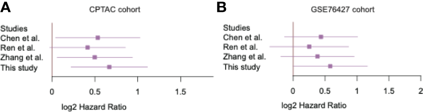 The three pre-normalized gene expression datasets with clinical characteristics were downloaded from the Gene Expression Omnibus (GEO) database under accession number GSE14520 (15) and GSE76427 (16). The Clinical Proteomic Tumor Analysis Consortium (CPTAC) HCC data was obtained from NODE (The National Omics Data Encyclopedia) with under accession number OEP000321. The clinical characteristics of the three cohorts were summarized in Supplementary Table S1. Gene expressions were logarithmically transformed and then used for downstream data analyses.