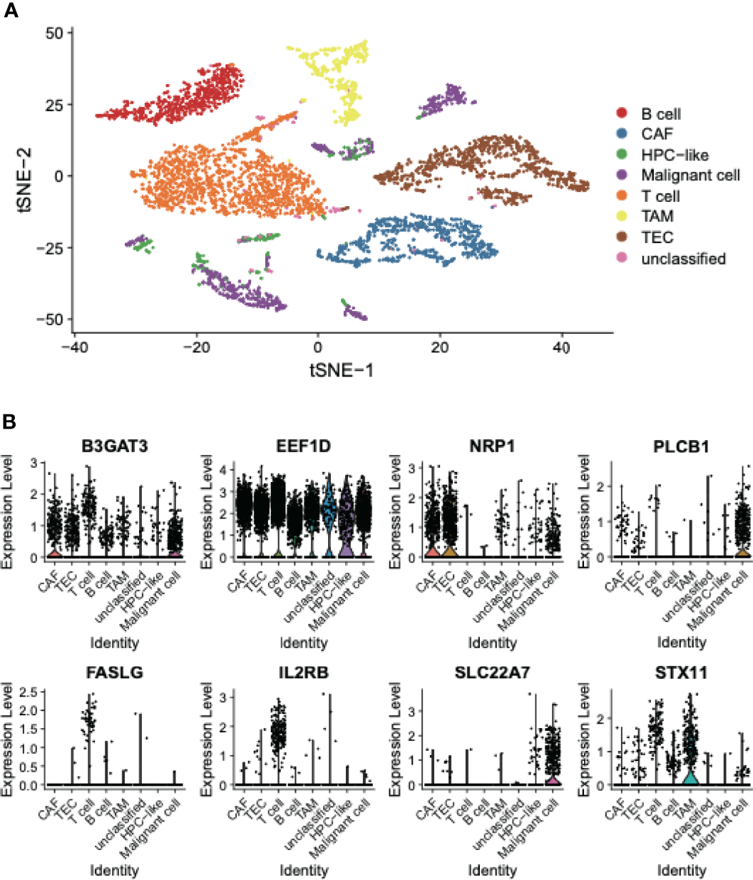 The cell type specific expression in HCC tissues. (A) The t-SNE plot represents the distribution of cell types in HCC tissues. (B) The expression patterns of the eight recurrence-related genes in the EGC model. The points represent the expression levels of the cells.
