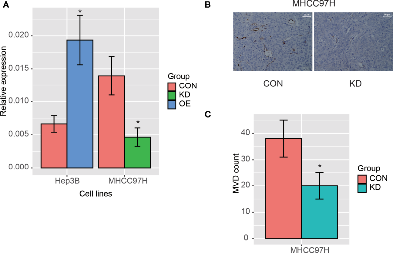 Male athymic BALB/c nu/nu mice of 18–20 g at 5 weeks’ age were handled according to the recommendations of the National Institutes of Health Guidelines for Care and Use of Laboratory Animals. The experimental protocol was approved by the Shanghai Medical Experimental Animal Care Committee. Human HCC tumor models produced by MHCC97H were established in nude mice by orthotopic inoculation. We silenced the expression of PLCB1 in MHCC97H cells using the small interface RNA (siRNA). Then, 1 × 105 cells were subcutaneously injected to form the tumors, which were inoculated in situ in nude mice (KD group), while CON group presented siRNA negative group. Briefly, the left lobe of the liver was exposed under anesthesia, and a part of the liver surface was mechanically injured with scissors. Then, a piece of MHCC97H tumor tissue (size 2 × 2 × 2 mm) was fixed within the liver tissue.
