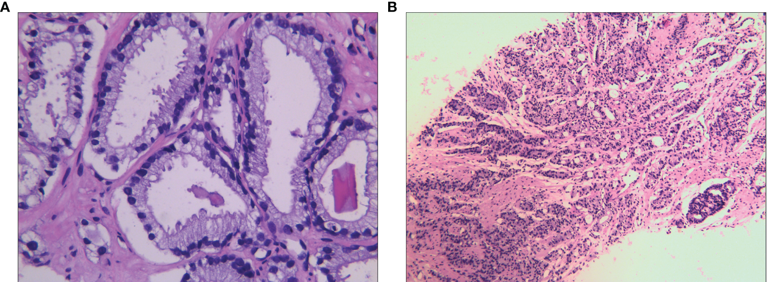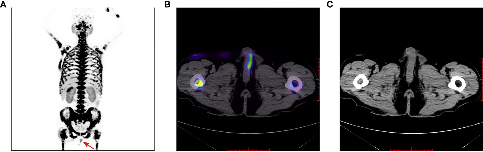 A 60-year-old man visited the hospital with the complaint of intermittent urethralgia and urine arrest. The preliminary screening revealed an elevated PSA of 40.688 ng/ml. Accordingly, prostate cancer was suspected and needle biopsy was performed, followed by confirmation of the adenocarcinoma of the prostate with a Gleason score of 3 + 4 = 7 (Figure 1). Considering the patient’s unwillingness to undergo surgery and external beam radiotherapy (EBRT), the ADT was adopted with bicalutamide and leuprorelin. PSA decreased significantly at the beginning of treatment, but increased gradually as the treatment progressed, to reach 4.86 ng/ml in October 2018. Prostate magnetic resonance imaging (MRI) confirmed prostate cancer with bladder invasion (Figure 2). The patient’s condition was evaluated comprehensively, and radical prostatectomy and cystectomy were conducted. Adenocarcinoma of prostate cancer combined with nerve and vascular invasion was confirmed with an elevated Gleason score of 5 + 5 = 10, and tumor invasions of the bladder neck, bladder mucosa, and submucosal muscularis were also observed. For the reconstruction of the urinary excretory system, ileocystoplasty was performed (Figure 3). A stable serum PSA level (PSA ≤ 0.03 ng/ml) was maintained to reveal a favorable prognosis within a year of surgery. However, a slightly elevated PSA level was noted with a value of 0.035 ng/ml in October 2019, for which ADT with bicalutamide and leuprorelin was undertaken. Biochemical recurrence was suspected, and PET/CT was performed after injection with 11.95 mCi (442.1 MBq) 18F-PSMA-1007 in August 2020 on the recommendation of the patient’s physician with a PSA of 0.072 ng/ml. Surprisingly, no other PSMA-avid foci were located in the prostatic bed and the pelvis, except for an intense uptake in the corpus cavernosum with a SUVmax of 6.4 (Figure 4). Considering the poor efficacy of ADT, abiraterone was applied; meanwhile, the usage of bicalutamide and leuprorelin was discontinued. Subsequently, an elevated PSA level was recorded (0.547 ng/ml) in March 2021 and in July 2021 (6.79 ng/ml) (Figure 5). Enzalutamide combined with denosumab was applied, but abiraterone was discontinued. After several months, the patient showed a marked increase in PSA value (>100 ng/ml), combined with penile bleeding. 18F-PSMA-1007 PET/CT revealed that the uptake of penile lesions was significantly higher (SUVmax 7.4) and that the range of lesions was enlarged than earlier; meanwhile, systemic bone metastasis was detected (Figure 6). Considering the poor prognosis, the patient refused to undergo penectomy, and hence palliative chemotherapy was adopted.